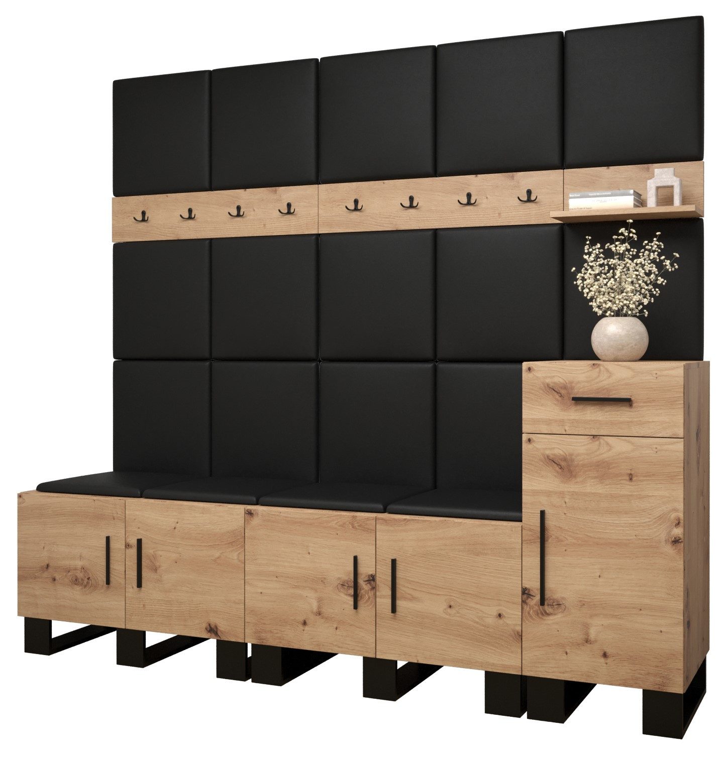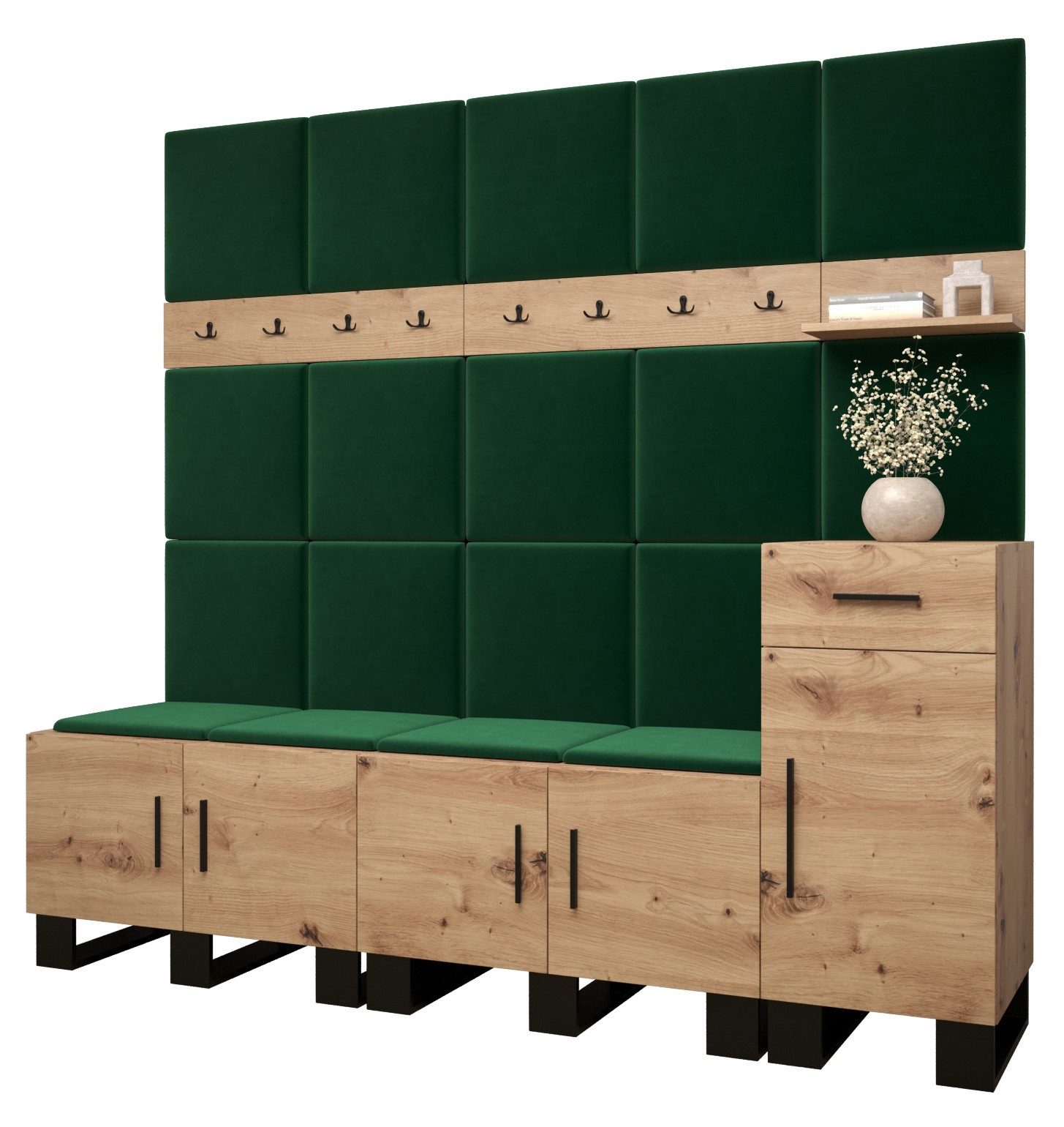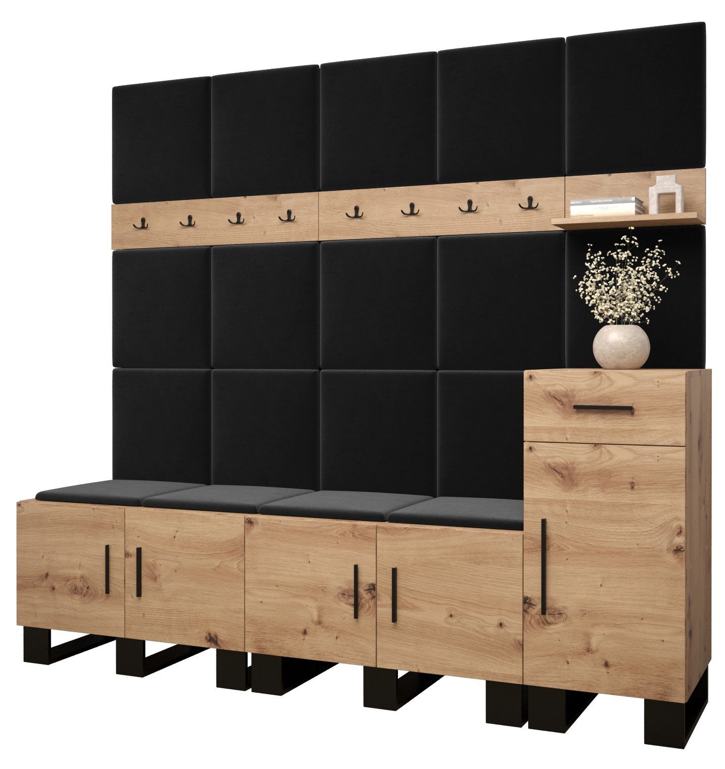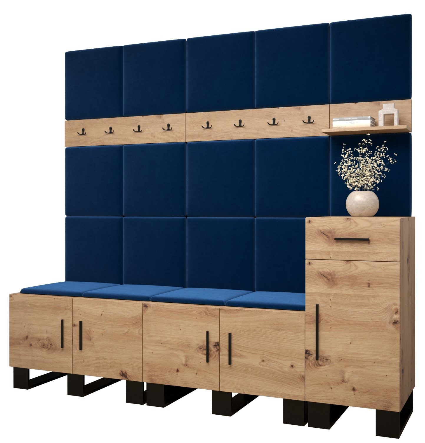Viel Platz: Der ARTIN-Garderobe ist ein Möbelstück im modernen Stil mit modischen Polsterpaneelen, eine große Anzahl von Regalen und Kleiderbügeln verleihen dem Kleiderschrank außergewöhnliche Funktionalität. Elegantes Design und eine große Auswahl an Paneelfarben ermöglichen es Ihnen, die Garderobe in Ihrem Flur frei zu gestalten!