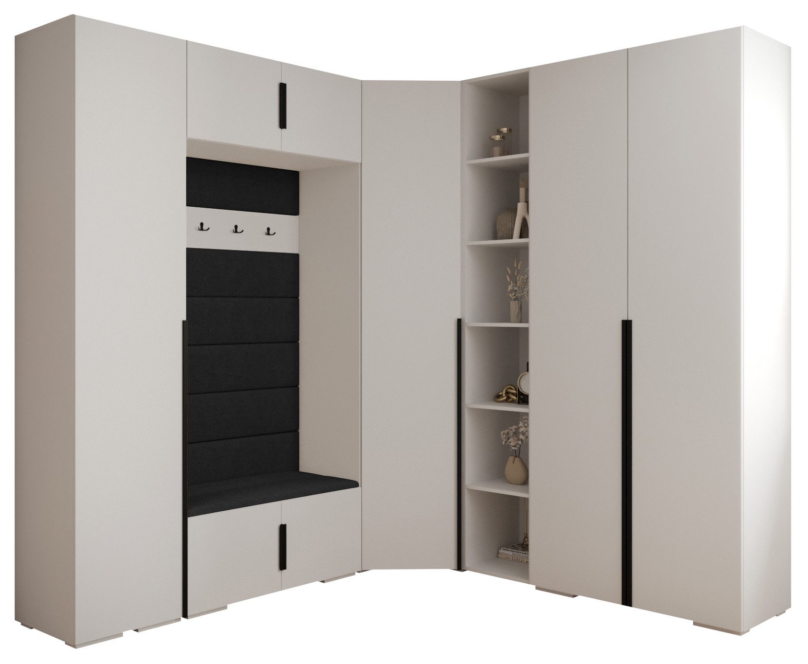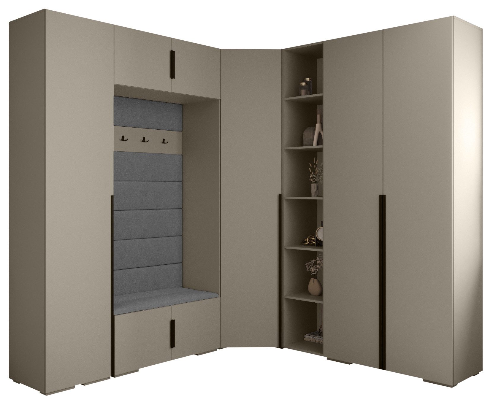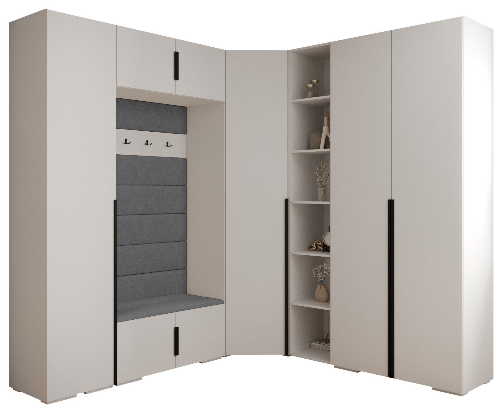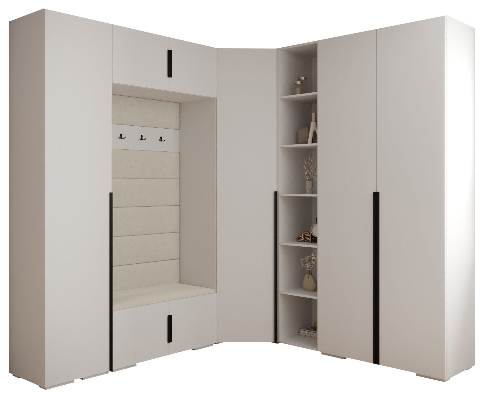 Viel Platz: Die Garderobe besteht aus einem Eckschrank mit 5 Einlegeböden links, zwei Einlegeböden rechts mit Kleiderstange, einem Schrank mit 2 Einlegeböden oben, ausziehbarer Kleiderstange und 2 Einlegeböden unten, einem 1SZ-Schrank mit Trennwand, ausziehbarer Kleiderstange und 2 Einlegeböden auf jeder Seite, einer Garderobe mit Schrank, gepolsterten Paneelen und Aufbewahrungsbehälter so wie einem Bücherregal mit 5 Einlegeböden.