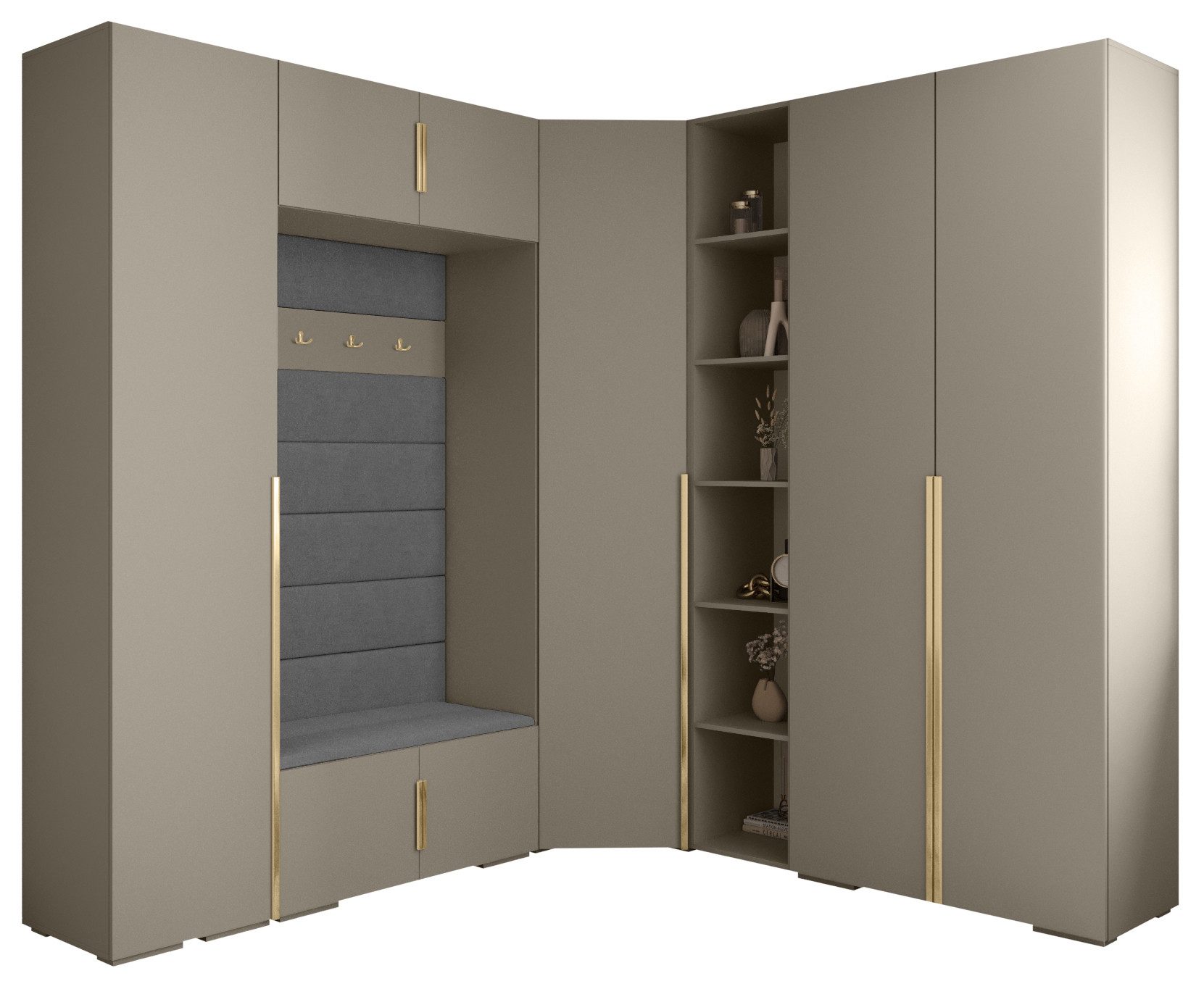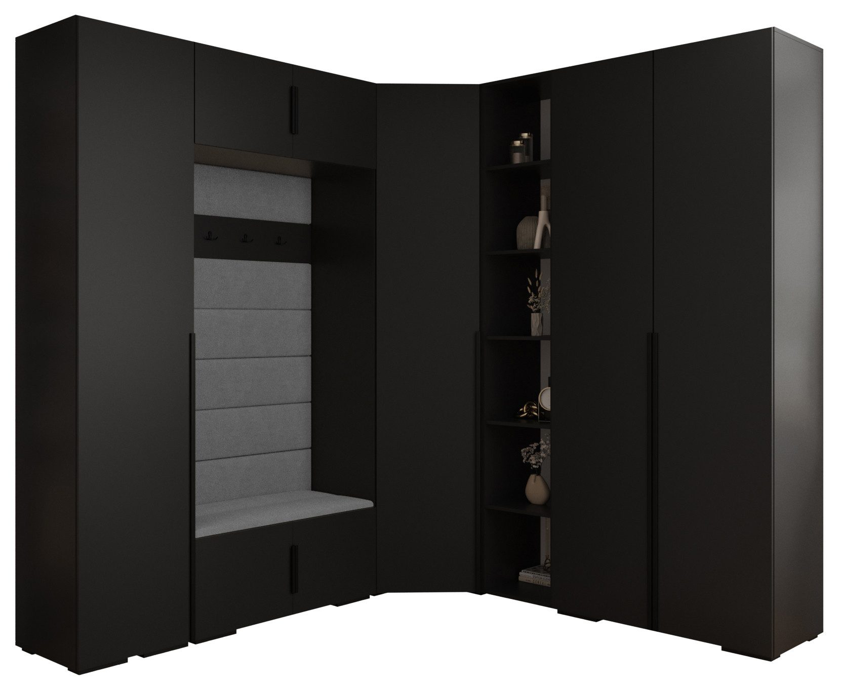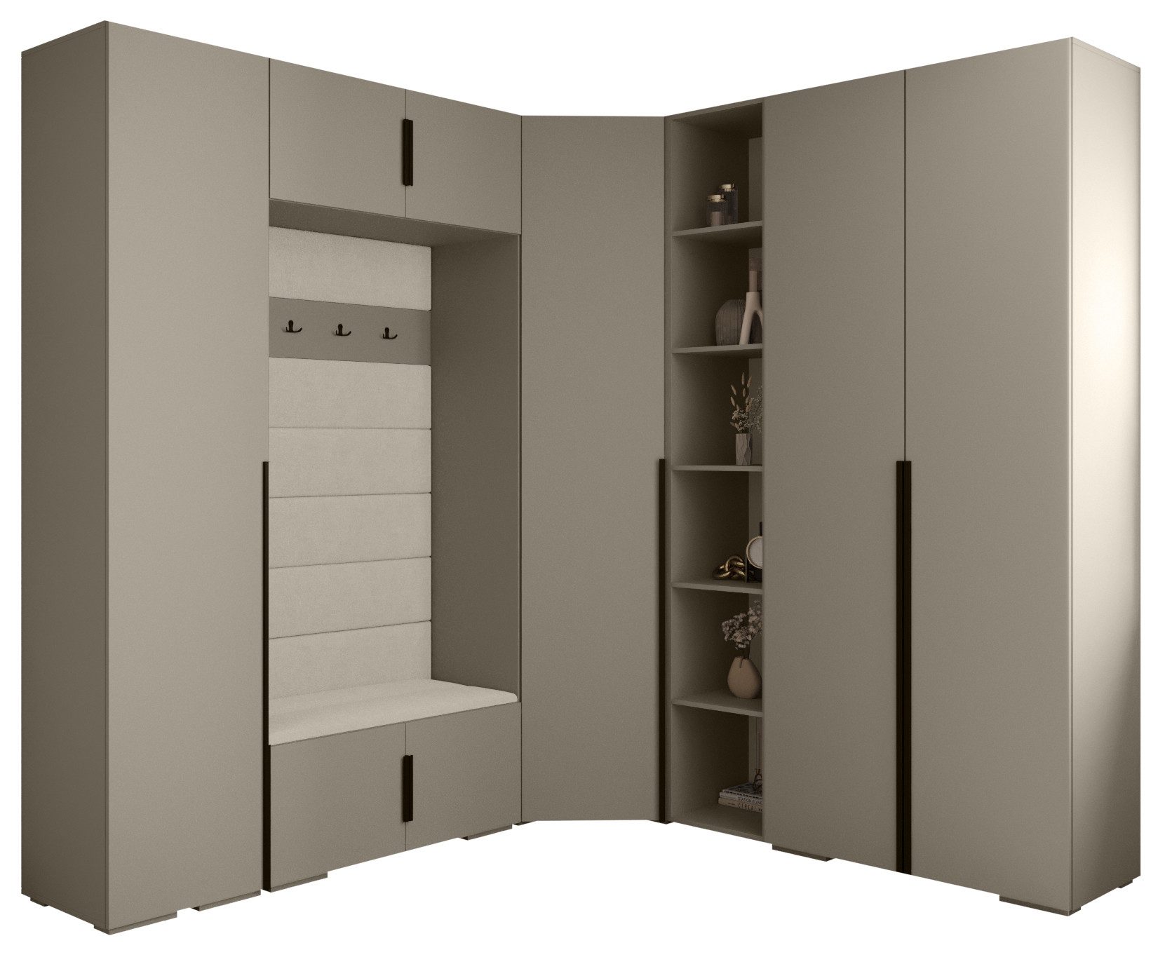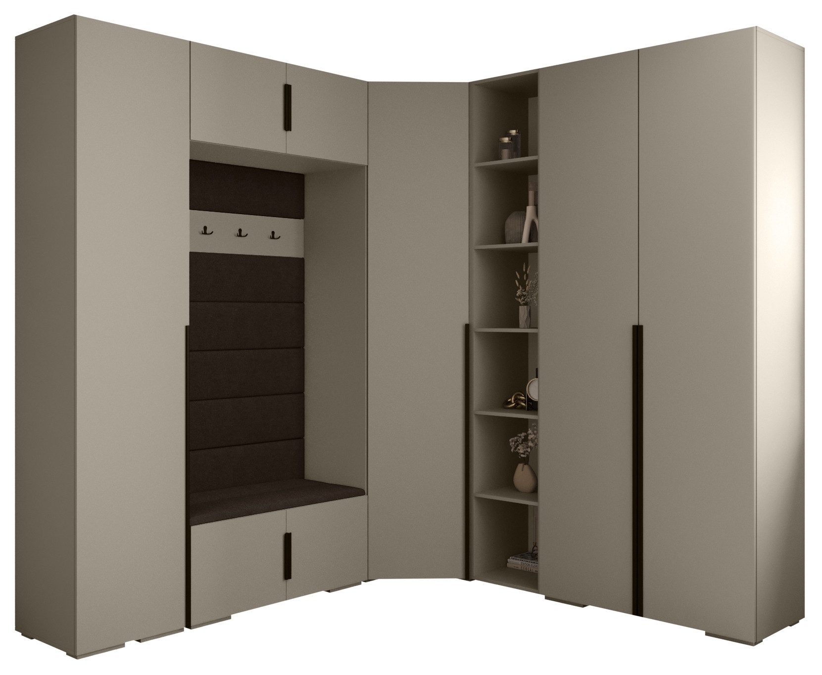 Viel Platz: Die Garderobe besteht aus einem Eckschrank mit 5 Einlegeböden links, zwei Einlegeböden rechts mit Kleiderstange, einem Schrank mit 2 Einlegeböden oben, ausziehbarer Kleiderstange und 2 Einlegeböden unten, einem 1SZ-Schrank mit Trennwand, ausziehbarer Kleiderstange und 2 Einlegeböden auf jeder Seite, einer Garderobe mit Schrank, gepolsterten Paneelen und Aufbewahrungsbehälter so wie einem Bücherregal mit 5 Einlegeböden.