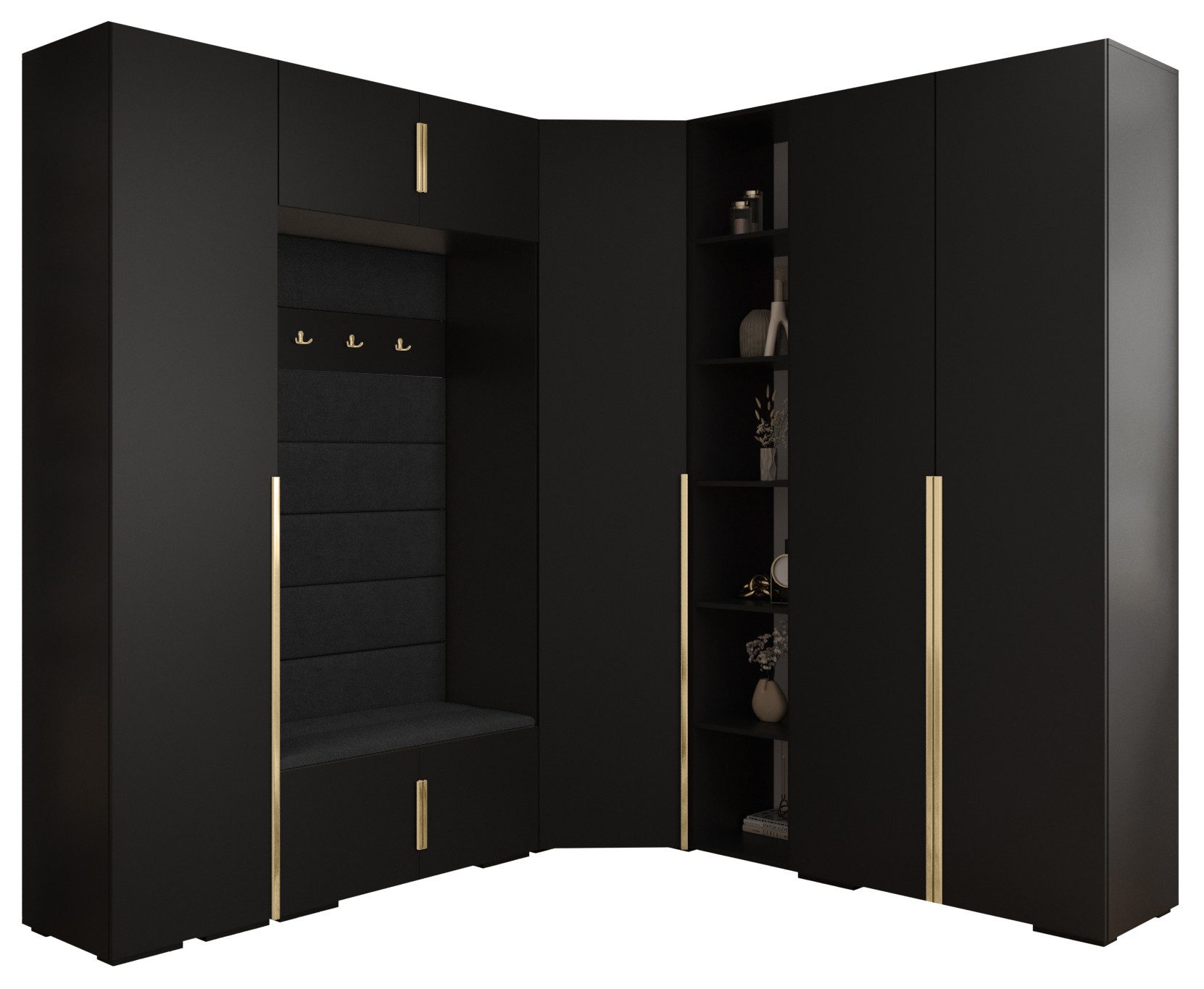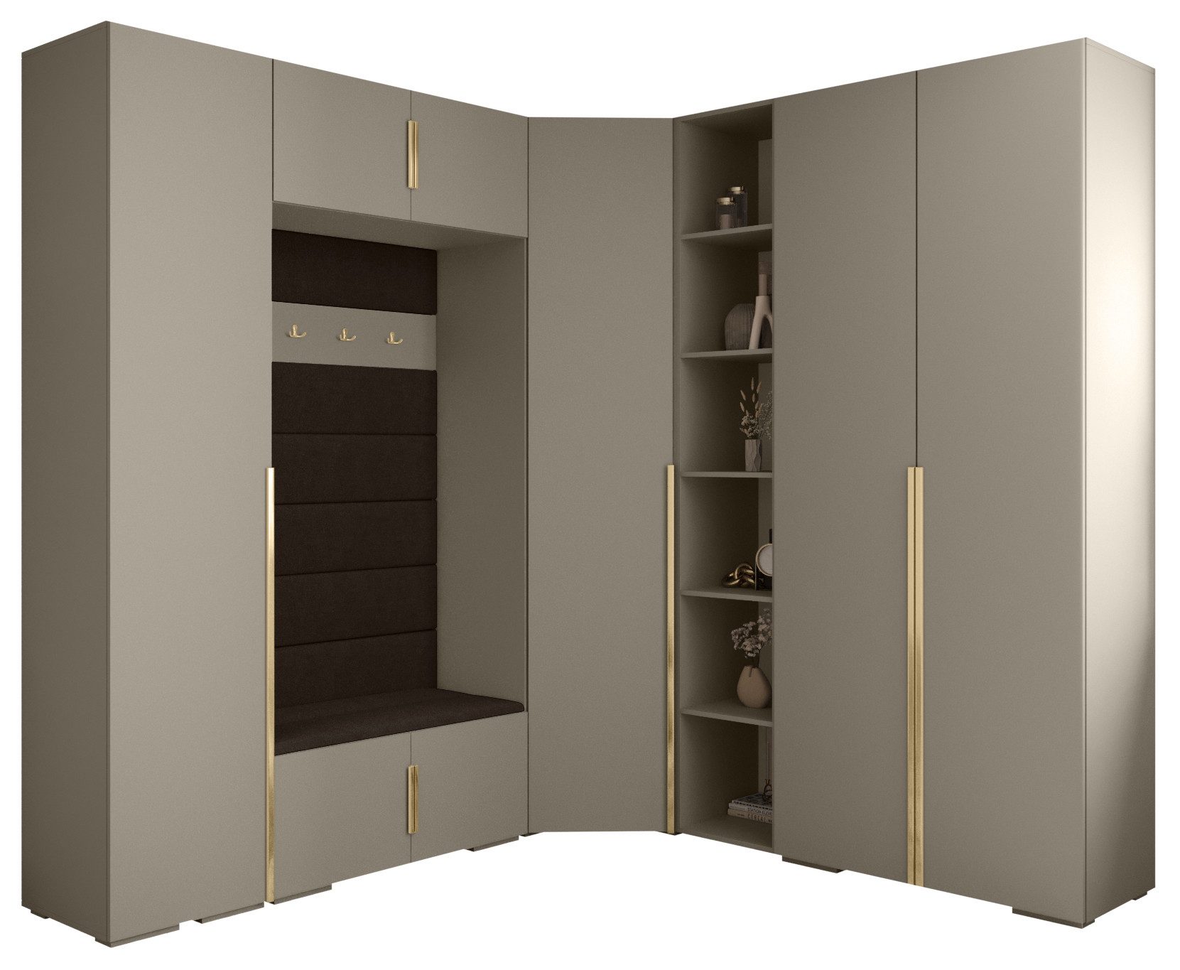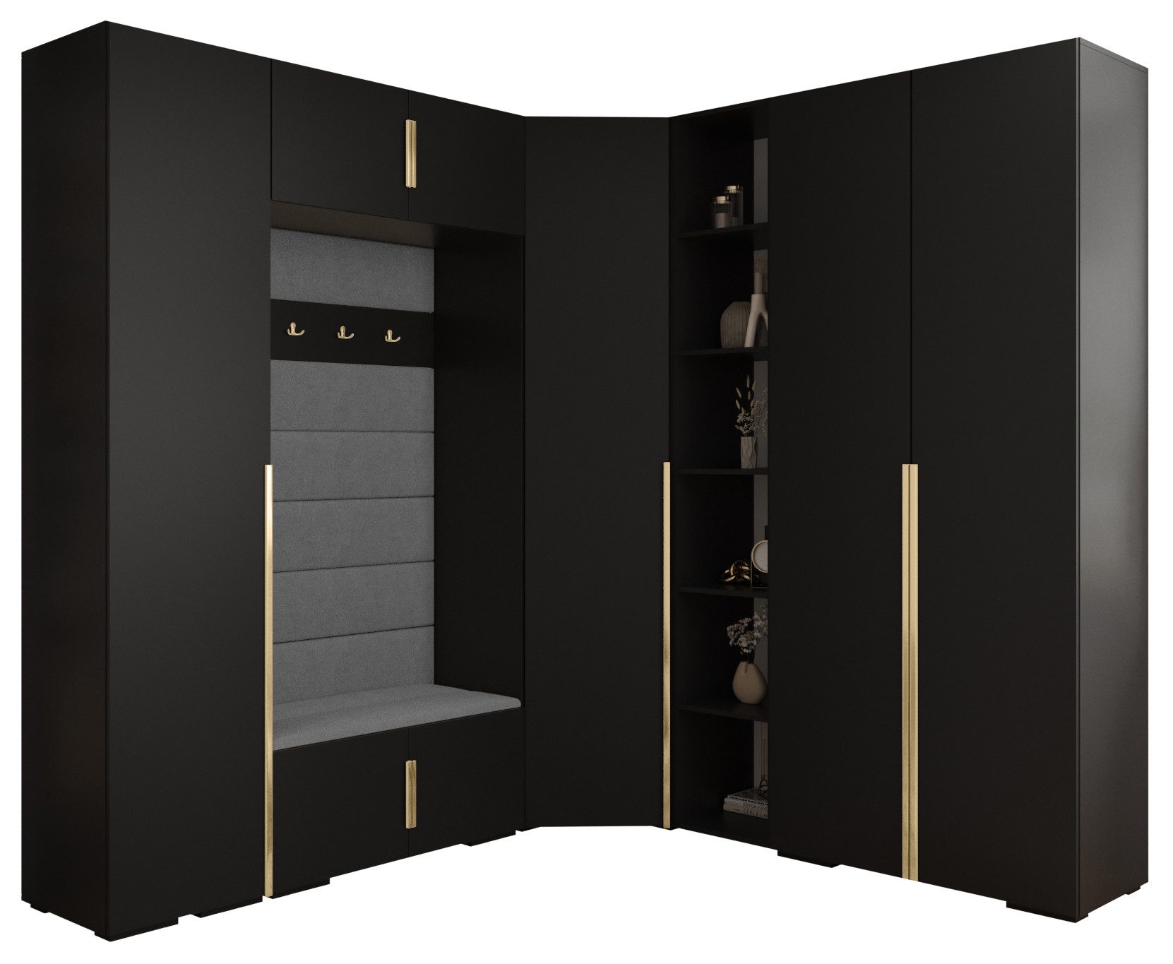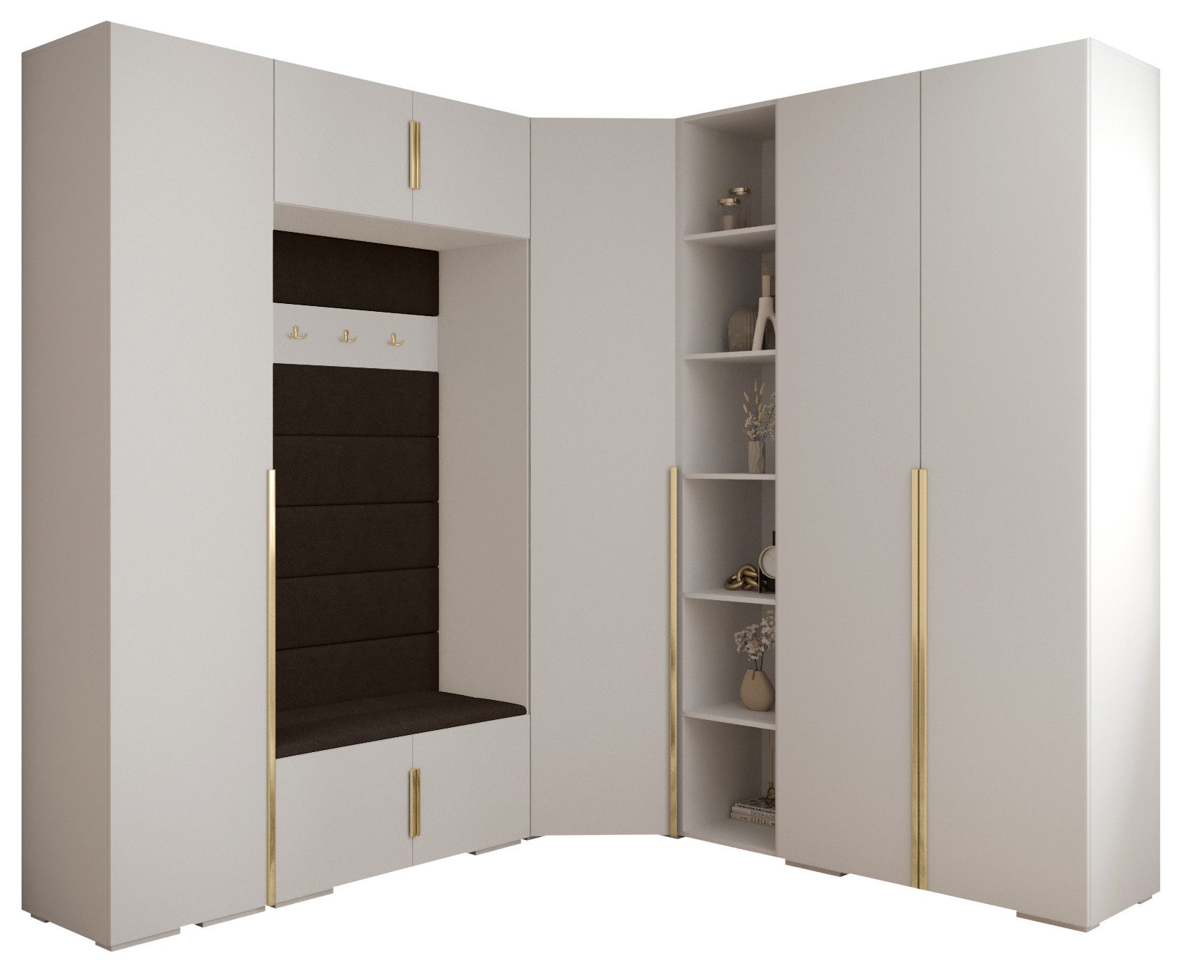 Viel Platz: Die Garderobe besteht aus einem Eckschrank mit 5 Einlegeböden links, zwei Einlegeböden rechts mit Kleiderstange, einem Schrank mit 2 Einlegeböden oben, ausziehbarer Kleiderstange und 2 Einlegeböden unten, einem 1SZ-Schrank mit Trennwand, ausziehbarer Kleiderstange und 2 Einlegeböden auf jeder Seite, einer Garderobe mit Schrank, gepolsterten Paneelen und Aufbewahrungsbehälter so wie einem Bücherregal mit 5 Einlegeböden.
