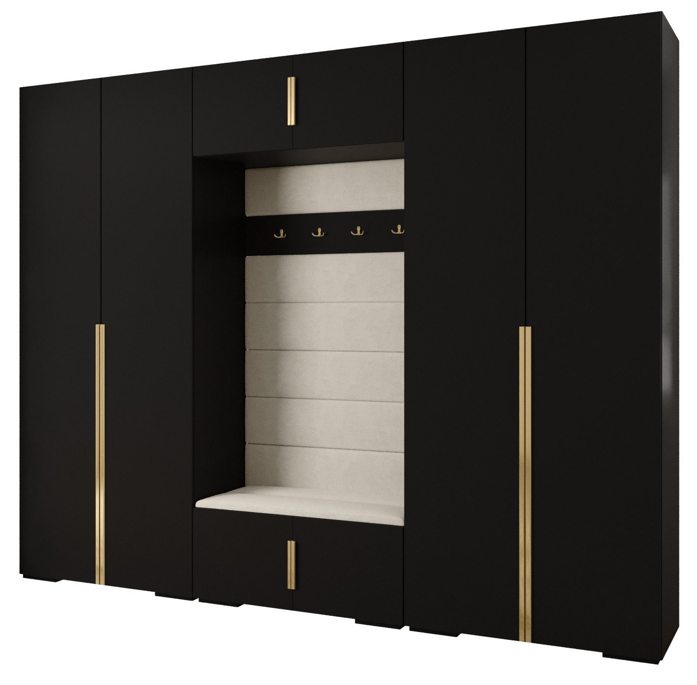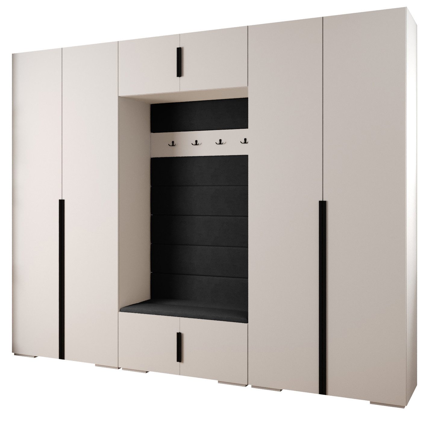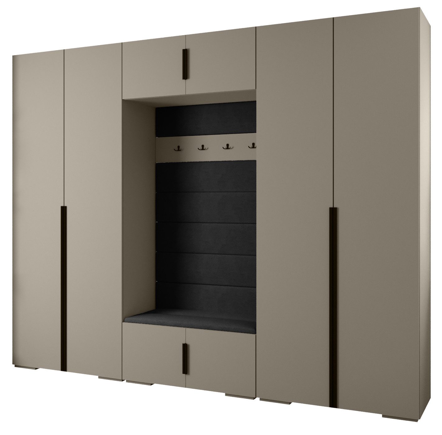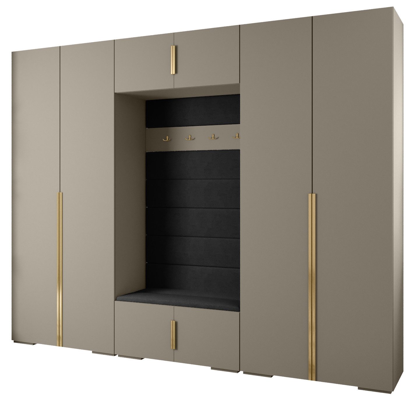 Technische Spezifikationen: Höhe: 236,7 cm, Breite: 300 cm, Tiefe: 47 cm. Erhältliche Farben des Korpus: Mattschwarz, Mattweiß und Kaschmir. Erhältliche Farben des Griffs: Mattschwarz oder Mattgold.