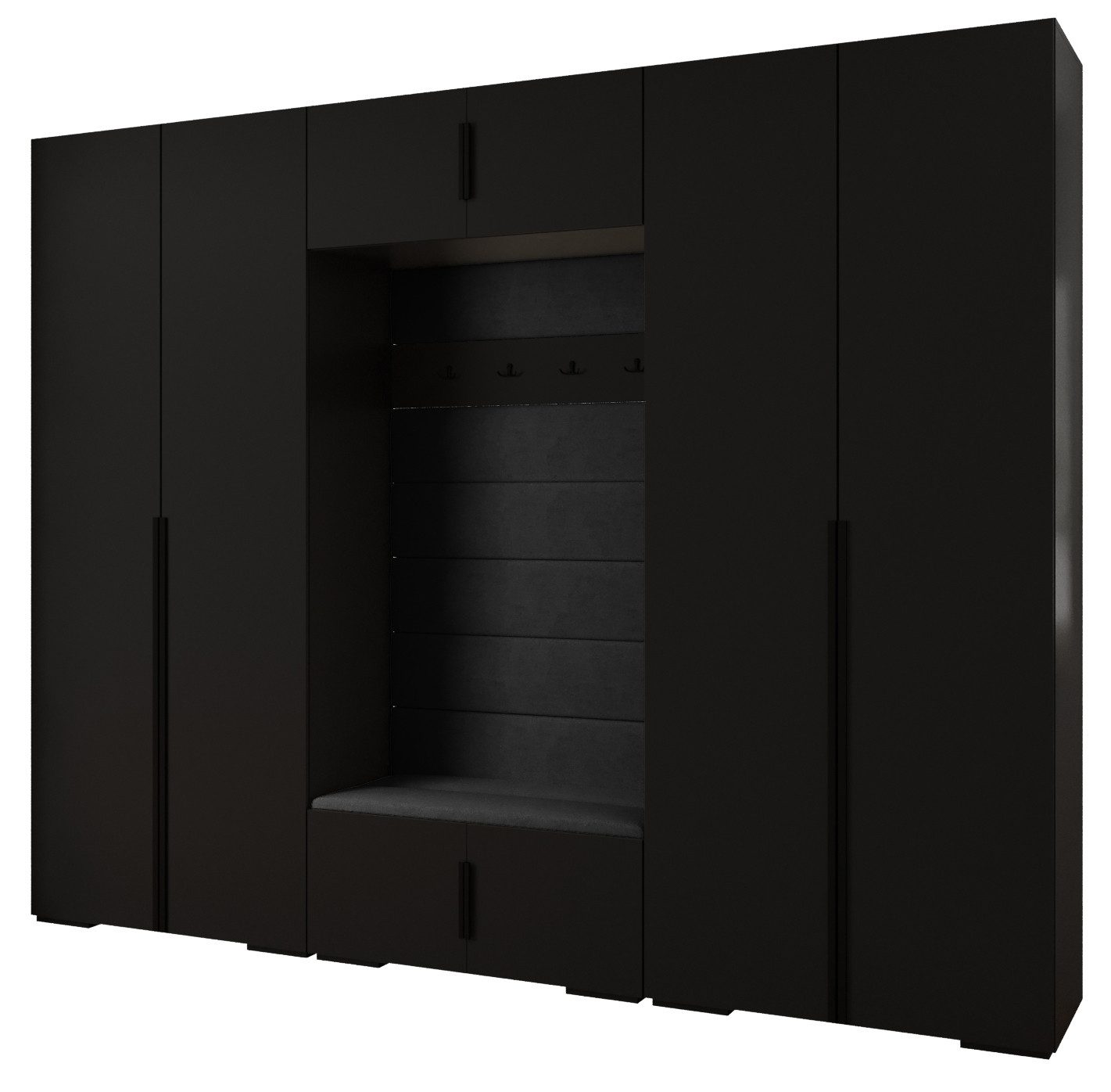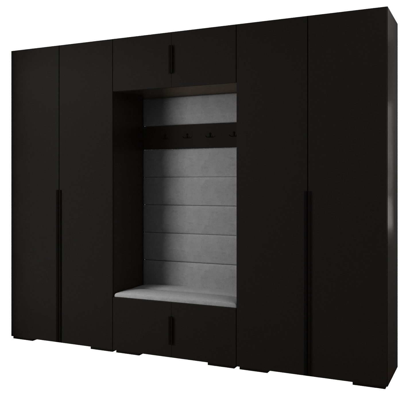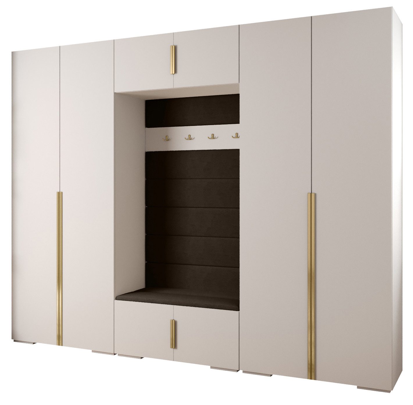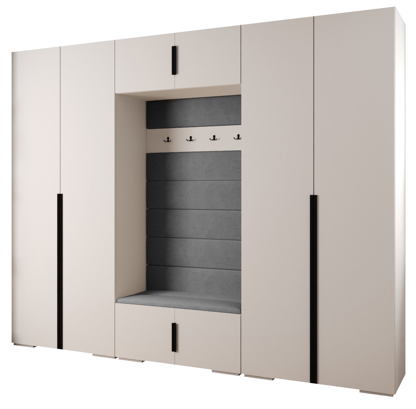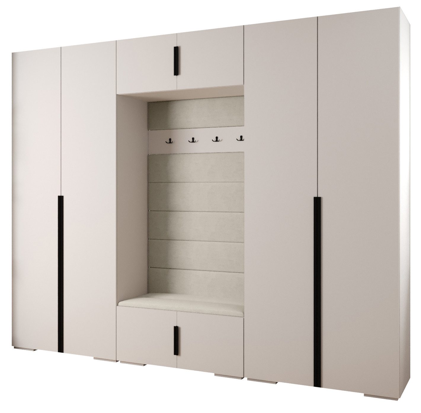 Technische Spezifikationen: Höhe: 236,7 cm, Breite: 300 cm, Tiefe: 47 cm. Erhältliche Farben des Korpus: Mattschwarz, Mattweiß und Kaschmir. Erhältliche Farben des Griffs: Mattschwarz oder Mattgold.