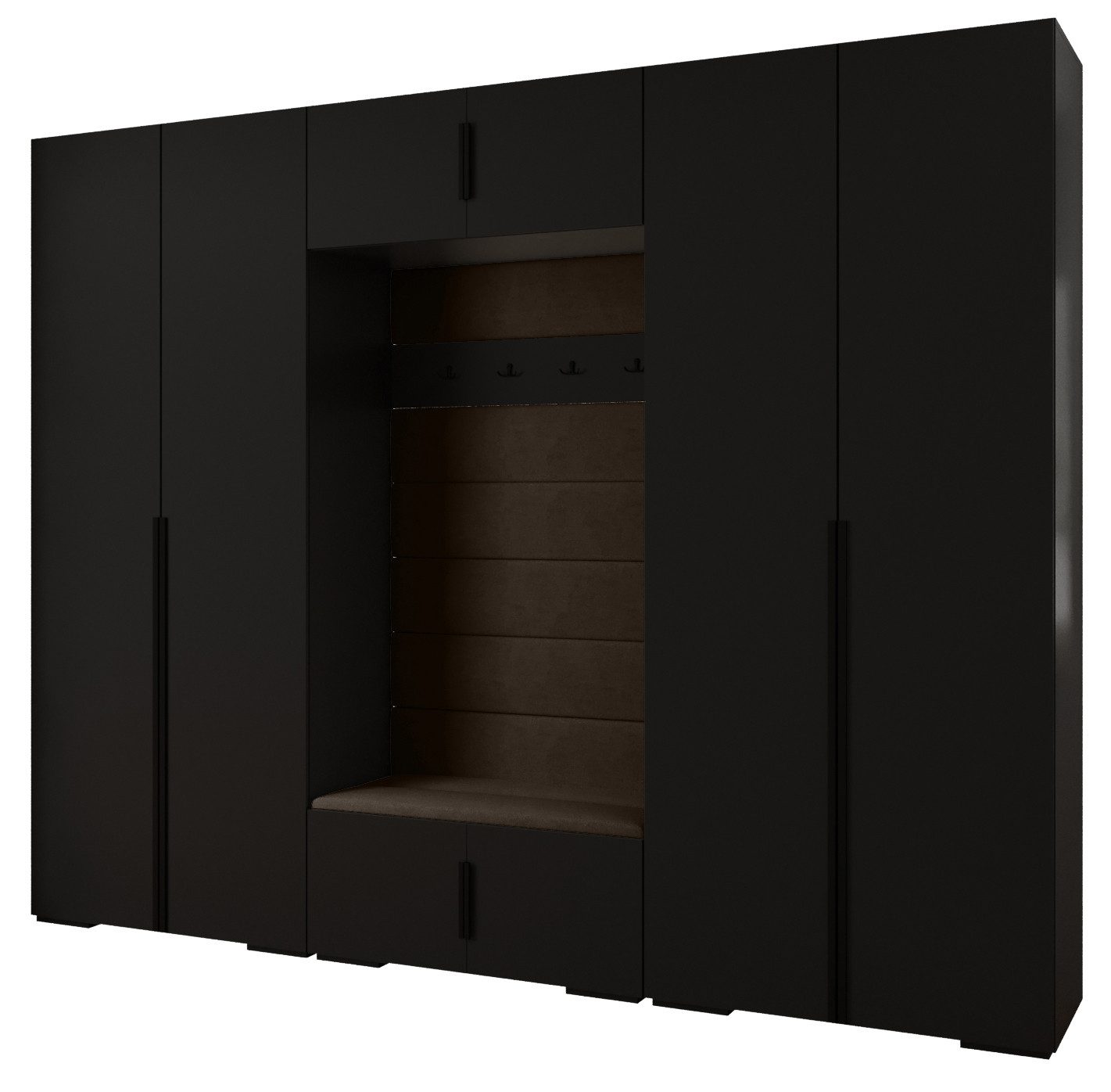 Viel Platz: Die Garderobe besteht aus einem Umkleideraum, in dem sich oben ein Schrank mit vier Regalböden, gepolsterte Paneele mit vier Kleiderbügeln und unten eine Aufbewahrungswanne mit vier Regalböden sowie zwei 1SZ-Schränke befinden, die durch eine Trennwand geteilt sind - in jedem Teil oben zwei Regalböden, darunter eine ausziehbare Kleiderstange und unten zwei Regalböden.