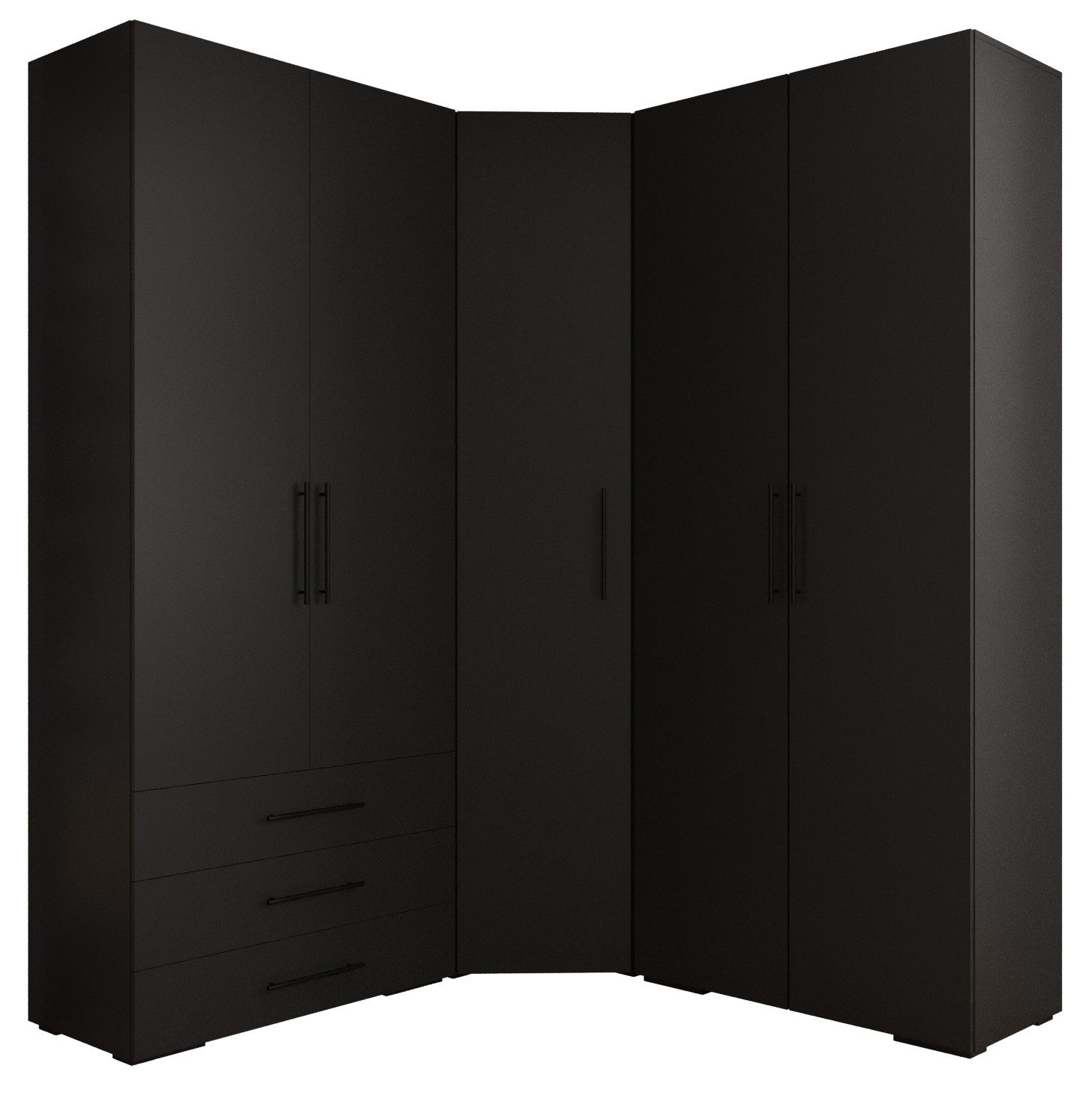 Viel Platz: Die Garderobe besteht aus einem Schrank 2D3SZ, der durch eine Trennwand unterteilt ist - in jedem Teil oben zwei Einlegeböden, darunter eine ausziehbare Stange; unten drei Schubladen, einem Eckschrank mit 5 Einlegeböden links, zwei Einlegeböden rechts und unter jedem eine Stange zum Aufhängen von Kleidung und einem Schrank 1SZ, der durch eine Trennwand unterteilt ist - in jedem Teil oben zwei Einlegeböden, darunter eine ausziehbare Stange und unten zwei Einlegeböden.