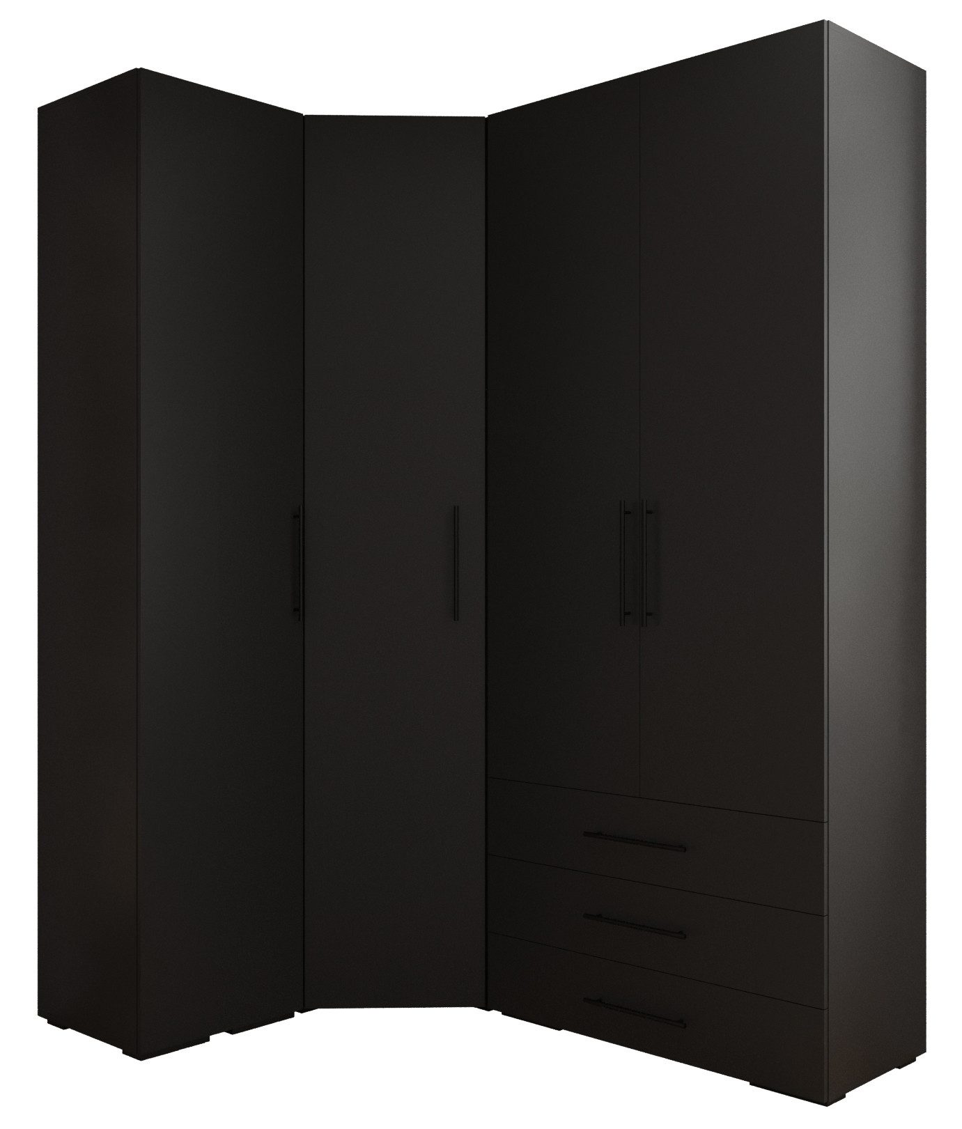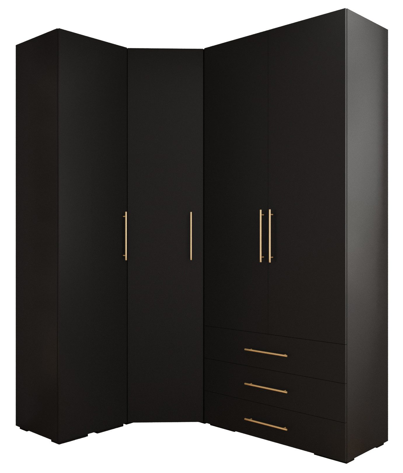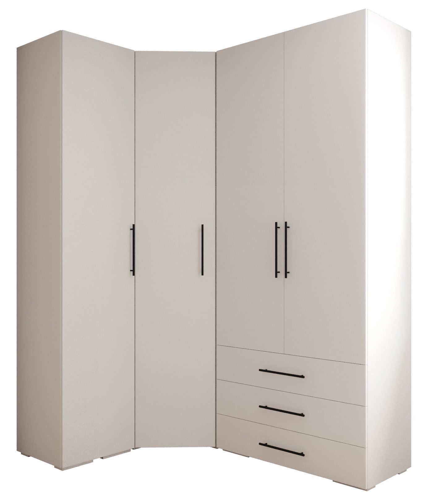 Viel Platz: Die Garderobe besteht aus einem Eckschrank mit 5 Regalböden links, zwei Regalböden rechts und unter jedem Regalboden eine Kleiderstange zum Aufhängen der Kleidung, einem Schrank 2D3SZ, der durch eine Trennwand unterteilt ist - in jedem Teil oben zwei Regalböden, darunter eine ausziehbare Kleiderstange; unten drei Schubladen und ein Schrank mit zwei Regalböden oben, darunter eine ausziehbare Kleiderstange und unten zwei Regalböden.