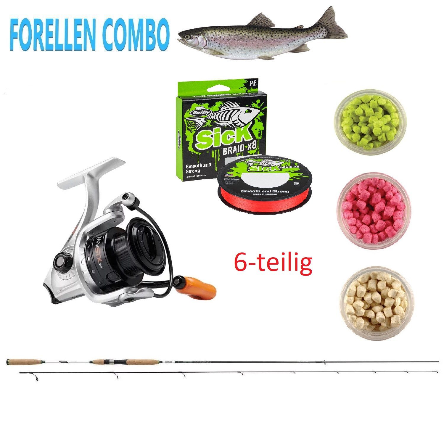 Ein 6- teiliges Forellen-Set ist hervorragend aufeinander abgestimmt für erfolgreiches Angeln auf Forellen. Im Set enthalten sind Rute, Rolle, gefochtene Schnur und Köder Dieses hochwertige Forellen-Set ist sowohl für Anfänger als auch für erfahrene Angler geeignet, zu einem erschwinglichen Preis. Produktinfos: Die Mitchell Epic Spinnrute ist eine leichte Rute mit schlanken und empfindlichen 30T Carbon Blanks. Sie wurde von Forellenanglern speziell für die Bedürfnisse der Forellenangelei in Europa entwickelt bzw. angepasst. -Von Forellenangler für Forellenangler entwickelt -Dünner und gefühlvoller 30T Carbonblank -weicher, gummiüberzogener Rollenhalter -Elegantes gold-schwarzes Aussehen -Hochwertiger Korkgriff + Die Max STX Spinnrolle bietet höchste Leistung mit innovativem Design und verfügt neben dem Rocket Line Management System™, über die neuesten Designverbesserungen. Sie verfügt über fünf Lager mit einem zusätzlichen Instant Anti-Reverse Lager und einem Everlast™ Bügelsystem. + Berkley® PowerBait® Chroma-Glow Crappie Nibbles sind weich, aber langlebig. Die vorgeformten Häppchen lassen sich leicht anwenden ohne große Sauerei. Der Köder hat eine sich langsam zerstreuende Duftwolke, die Crappie und Panfish anziehen - für noch mehr Bisse! + Schnur: Null Dehnung: für außergewöhnliche Sensibilität, damit Sie auch unter den schwierigsten Bedingungen Fische fangen können. Überragende Knotenfestigkeit: Berkley SICK 8fach-geflochtene Schnüre sorgen für felsenfeste und sichere Knoten. Hohe Leistung und weite Würfe: Sick-Schnüre mit Hightech-Nano-Mikrokristallin, das eine hohe Abriebfestigkeit und extreme Geschmeidigkeit für weite Würfe bietet. Multipurpose: Berkley SICK PE-Geflecht ist für den Fang aller Raubfischarten konzipiert, die in unseren europäischen Gewässern schwimmen, wie Hecht, Zander, Barsch oder Forelle.