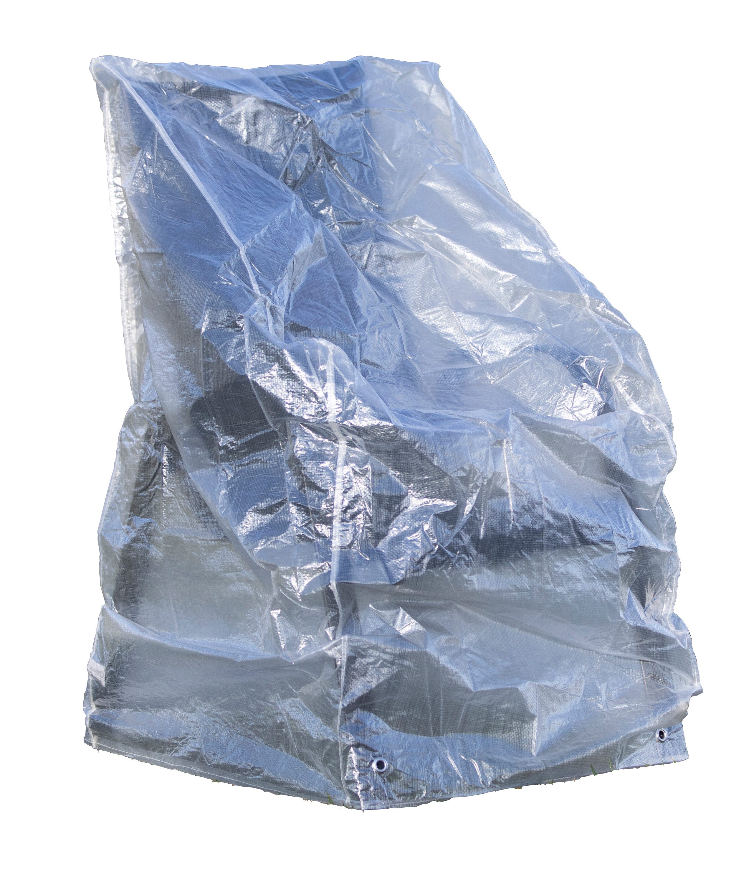 Mit dieser passgenauen Abdeckung für Stapel-, Klapp-oder Relaxgartenstühle sind Sie auf der sicheren Seite, wenn es um Schutz vor Feuchtigkeit, Staub, Schmutz und UV Strahlen bis zu 5000 Sonnenstunden geht. Bei regelmäßigem Gebrauch schützt die Folie Ihre Gartenstühle vor Witterungseinflüssen. Tipp : Bitte achten Sie auf mögliches Schwitzwasser, welches sich bei längerem Gebrauch bilden kann. Das abzudeckende Garten Mobiliar sollte immer etwas belüftet sein. PE Bändchengewebe. Transparente Farbe. Schutz für 5000 Sonnenstunden.
