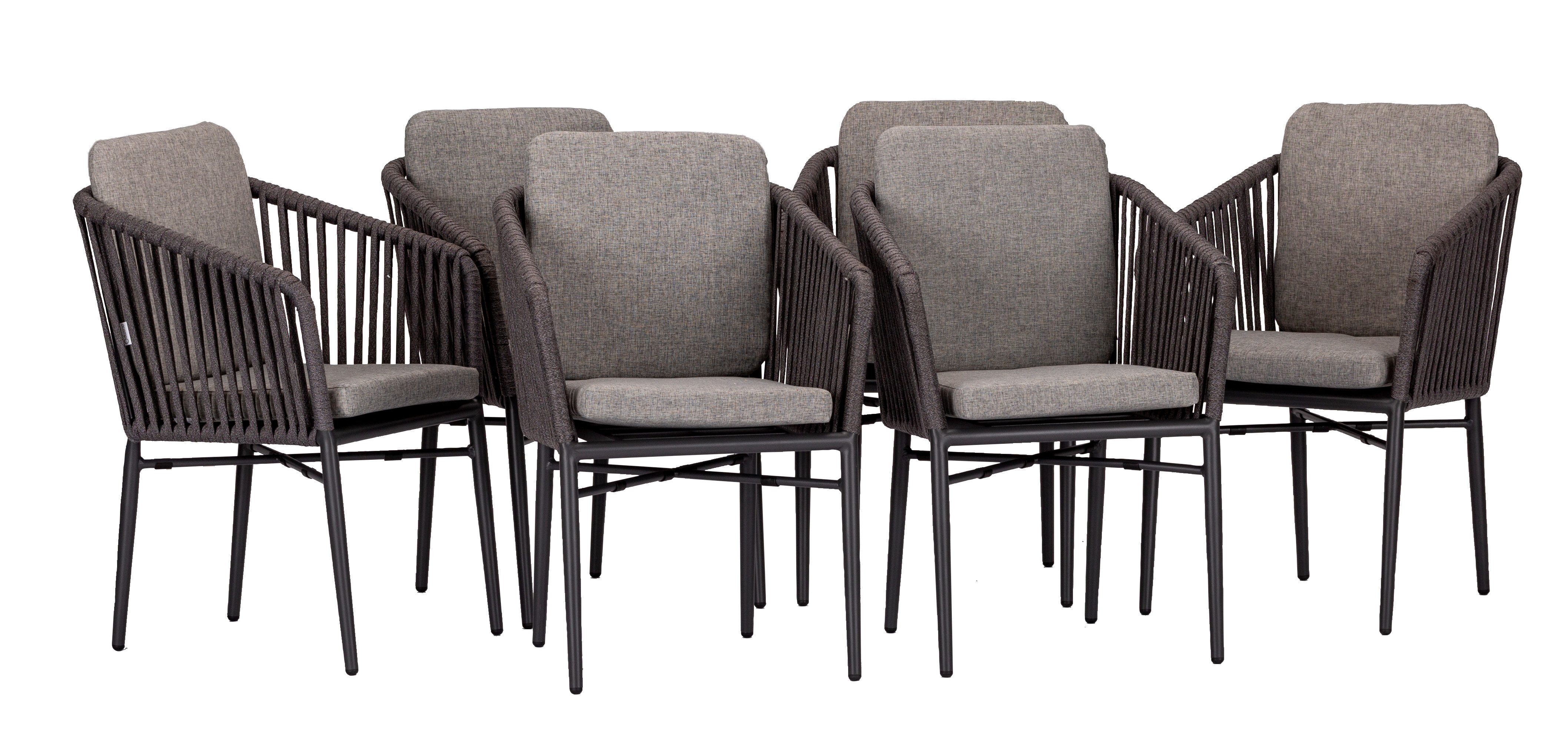 acamp® Set 6x MANHATTAN 57437 Stapelsessel. Der Sessel besticht durch einen einzigartigen, hochwertigen Material-Mix und erstrahlt dabei in einer zeitlosen Eleganz. Das leichte und dennoch robuste Aluminium-Gestell ist anthrazit pulverbeschichtet. Sie nehmen auf einem ca. 6 cm dickem Sitzkissen in der Farbe dunkelgrau meliert bequem Platz, ein zweiten Kissen polstert Ihre Rückenfläche. Keine Angst vor dem Ketchup -Malheur: Die Kissenhüllen sind mittels Reißverschlusses abziehbar und pflegeleicht in der Waschmaschine bei max. 30° zu reinigen. Die elegant geschwungene Arm-/Rückenlehne ist mit flachen Polyesterschnüren in der Farbe anthrazit meliert umwickelt und bietet daher einen traumhaften Sitzkomfort. Die gedeckten Farben in Kombination mit dem sehr hochwertigen Material-Mix ermöglichen den uneingeschränkten Einsatz im Objekt- und Gastronomie-Bereich. Der Stapelsessel MANHATTAN ist leicht zu transportieren und zu platzsparend stabelbar. Die bodenschonenden Fußgleiter sind nach Jahren des Gebrauchs leicht zu wechseln und als Ersatz jederzeit erhältlich - oder Sie bestellen diese gleich direkt dazu. Dieser Sessel ist nicht nur atemberaubend schön, sondern ein robuster und langlebiger Begleiter auf jeder Terrasse, auf dem Balkon oder in der Gartenwirtschaft. Der Sessel misst ca. (HxBxT) 81x61x61cm. Gewicht ca. 4kg. Anlieferung auf Palette.