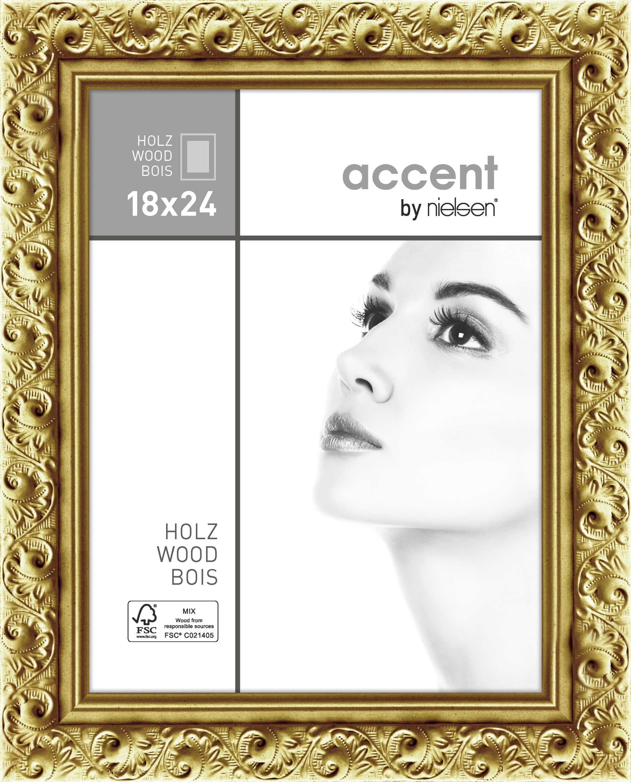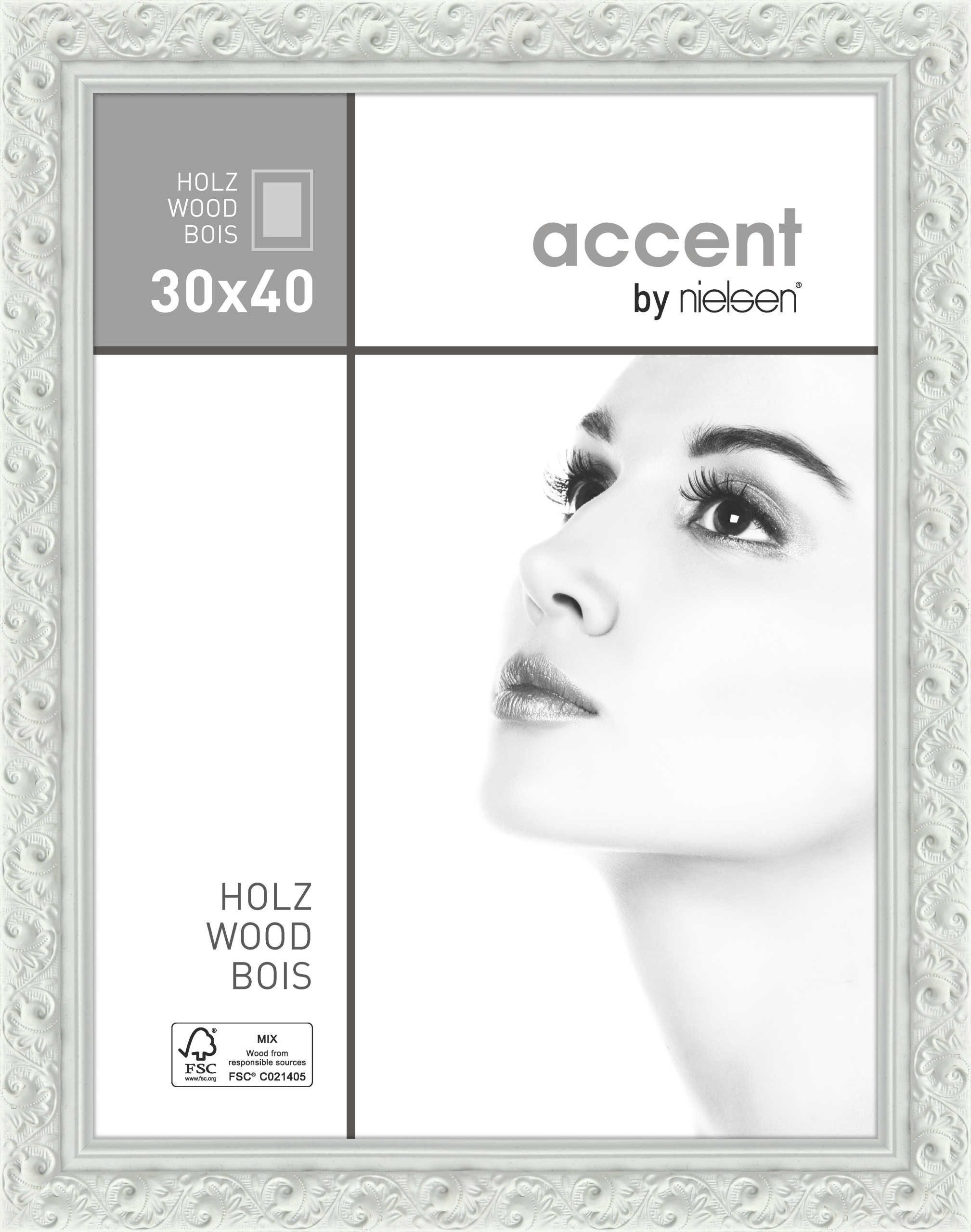 Der stilvolle Holzrahmen Arabesque der Marke Accent präsentiert Ihre Bilder mit einem 35,6 mm breiten, ornamentierten Profil auf elegante Weise. Er ist in vier verschiedenen Oberflächen und sieben Formaten erhältlich. Hergestellt aus FSC®-zertifiziertem Holz (Lizenzcode: FSC® C021405), stammt dieser Rahmen aus nachhaltig bewirtschafteten Wäldern, die den Kriterien des Forest Stewardship Council entsprechen.