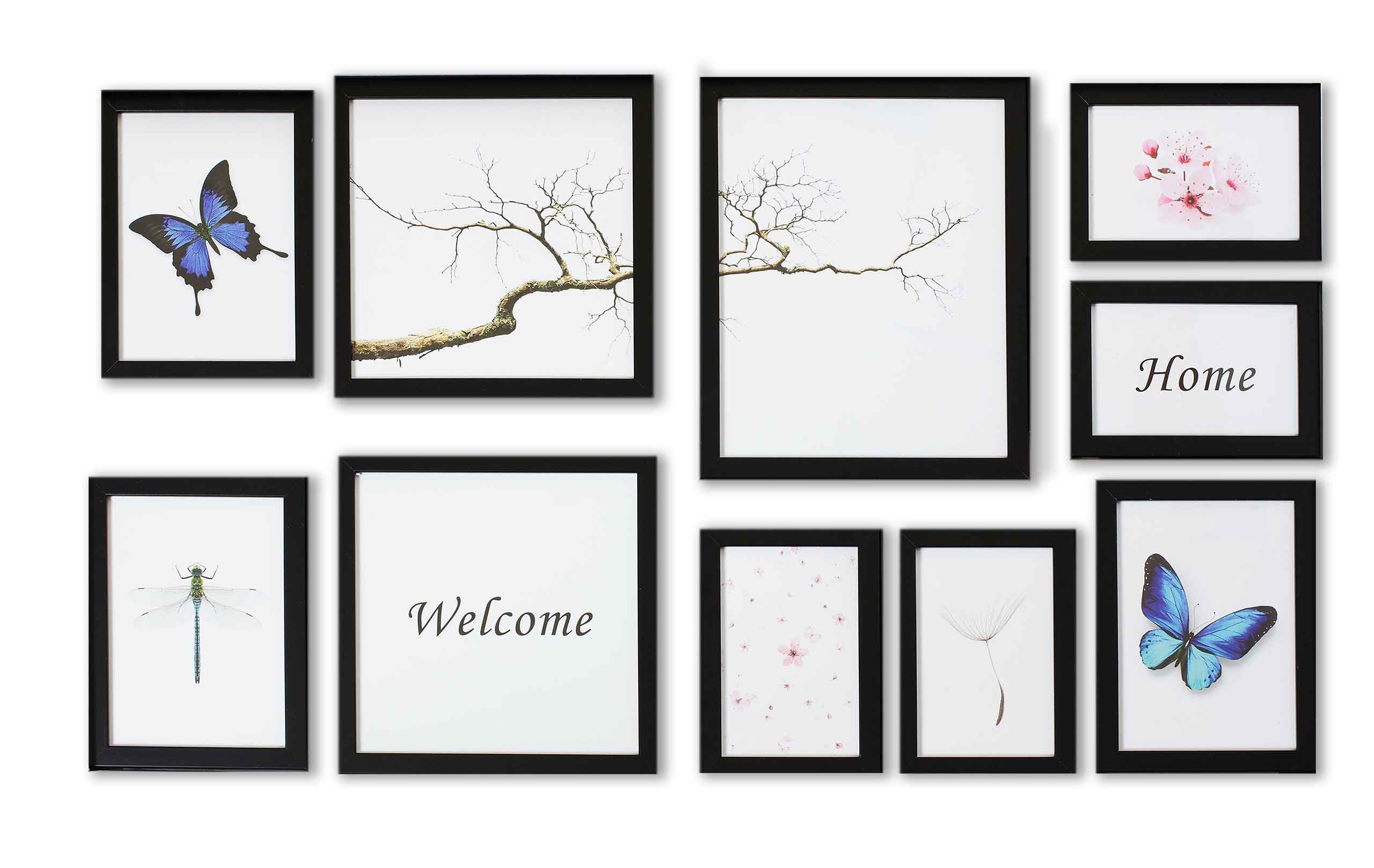 Die schwarzen Kunststoffrahmen sind aus einem Guss gefertigt, sodass keine Gehrungen sichtbar sind. Jede Rahmenrückwand besteht aus schwarzem Papier und ist mit einem Aufsteller sowie Aufhängern für die Montage im Hoch- und Querformat ausgestattet.
