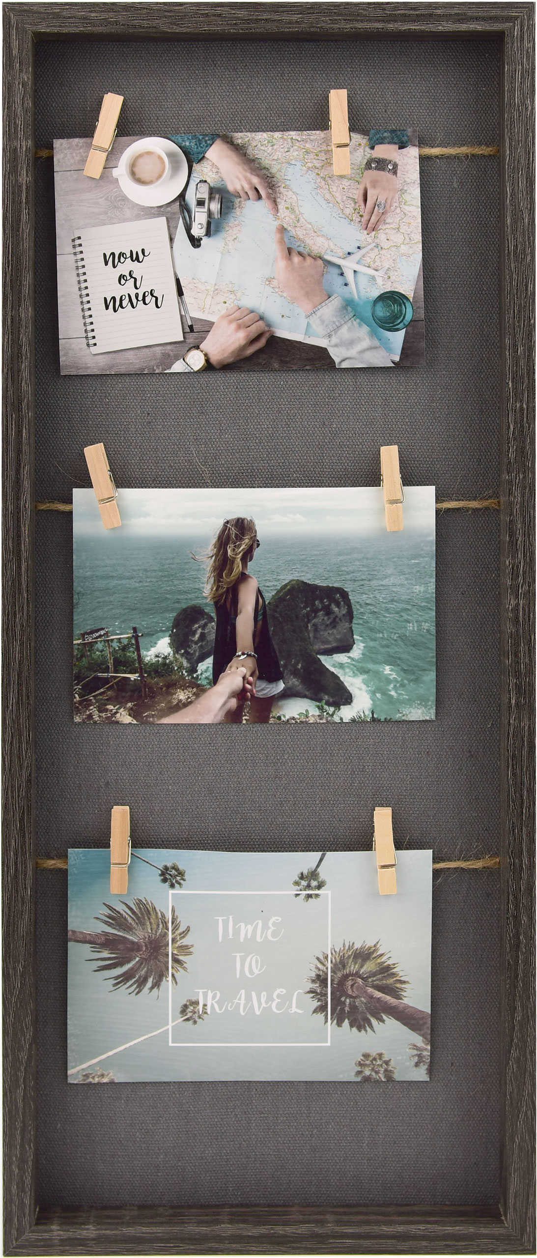 Der moderne Rahmen in dunkler Holzoptik wird durch eine graue, stoffähnliche Rückwand ergänzt. An drei Kordeln sind sechs Wäscheklammern befestigt, die eine kreative Präsentation Ihrer Erinnerungen ermöglichen.