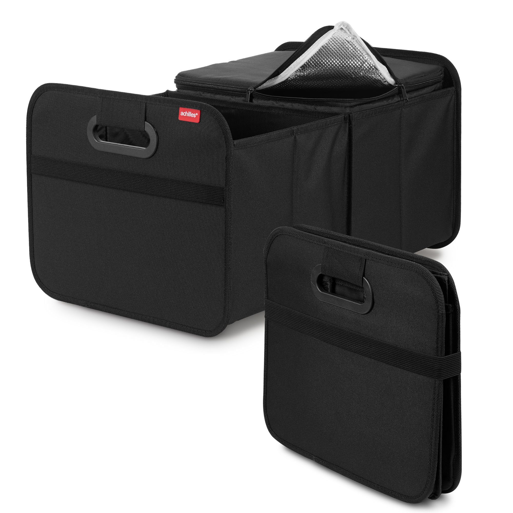 Egal ob für die Urlaubsfahrt, im Außendienst, die alltägliche Fahrt oder dem Kurztripp - die Faltbox für den Kofferraum von achilles verschafft viel sicheren Stauraum, ohne dass Ihre Sachen herumfliegen. Kombiniert mit einem Kühleinsatz hält die Autofaltbox Proviant, Snacks und Getränke kühl. In dem benachbarten Fach, indem kein Kühleinsatz verwendet wird, kann schnellzugängliches wie, Spielsachen, Kleidung, Sportsachen uvm. verstaut werden. Das Innenfutter der Kühltasche besteht aus isolierter Aluminium-Folie und ist mit Schaumstoff gepolstert, um eine gute Isolationswirkung zu gewährleisten und Lebensmittel frisch warm oder kühl zu halten. Deshalb kann die Temperatur im Inneren möglichst lange halten und den Inhalt vor der Außentemperatur zu schützen. Für einen sicheren Tragekomfort sorgt die formstabile Faltbox. Durch verstärkte Zwischen- und Außenwände und gepolsterte Griffe wird ausreichend für Stabilität und Langlebigkeit gesorgt! Die Kofferraumbox ist in wenigen Sekunden aufgebaut und bei Nichtgebrauch genau so schnell eingeklappt! So verlieren sie im Alltag keine Zeit! Im Inneren befindet sich zudem eine Netztasche, die auch kleinere Gegenstände zusammenhält! Transportieren und Verstauen leicht gemacht! Das Design erlaubt eine platzsparende Aufbewahrung. Mit dem Gummiband wird die Faltbox für den Kofferraum fixiert. Ideal zur Aufbewahrung im Auto oder zuhause. Aufgefaltet hat sie ein Format von 50 cm x 32 cm x 27 cm. Durch das pflegeleichte Material ist die Kofferraumbox wasserabweisend und bei Verschmutzung leicht mit einem feuchten Tuch zu reinigen! Dadurch ist die Handhabung insgesamt einfach fantastisch!