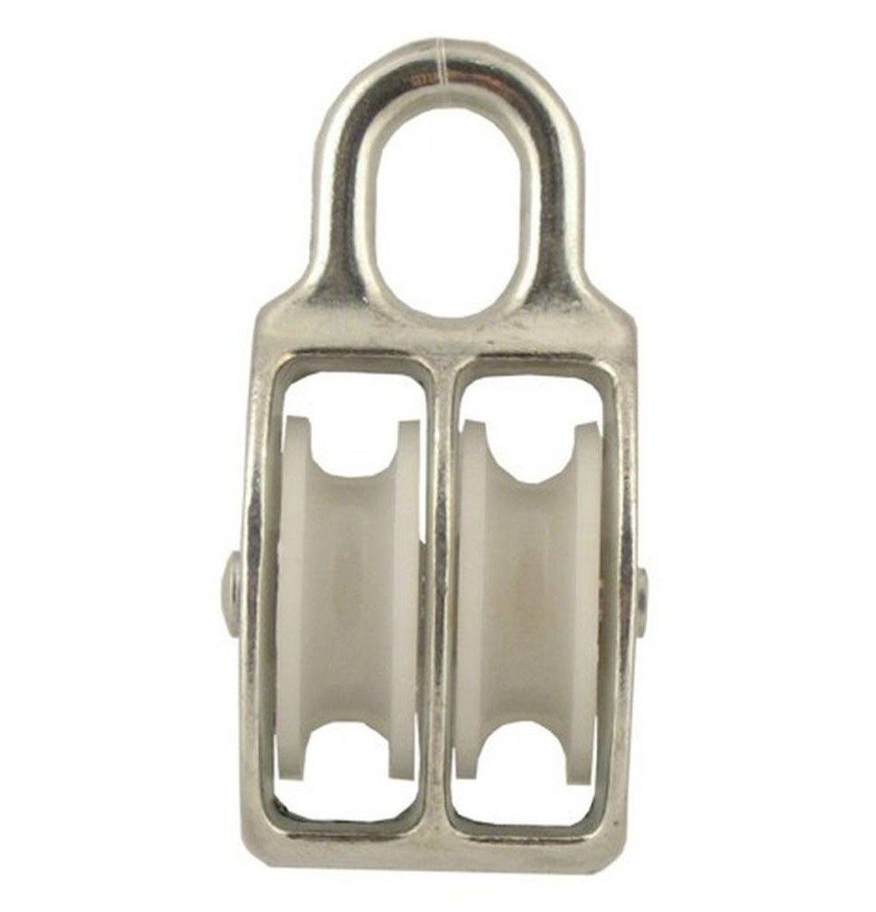Blockseilrolle aus verzinktem Stahl, doppelt, mit Umlenkrollen aus Kunststoff. Für Seile bis 6 mm Ø