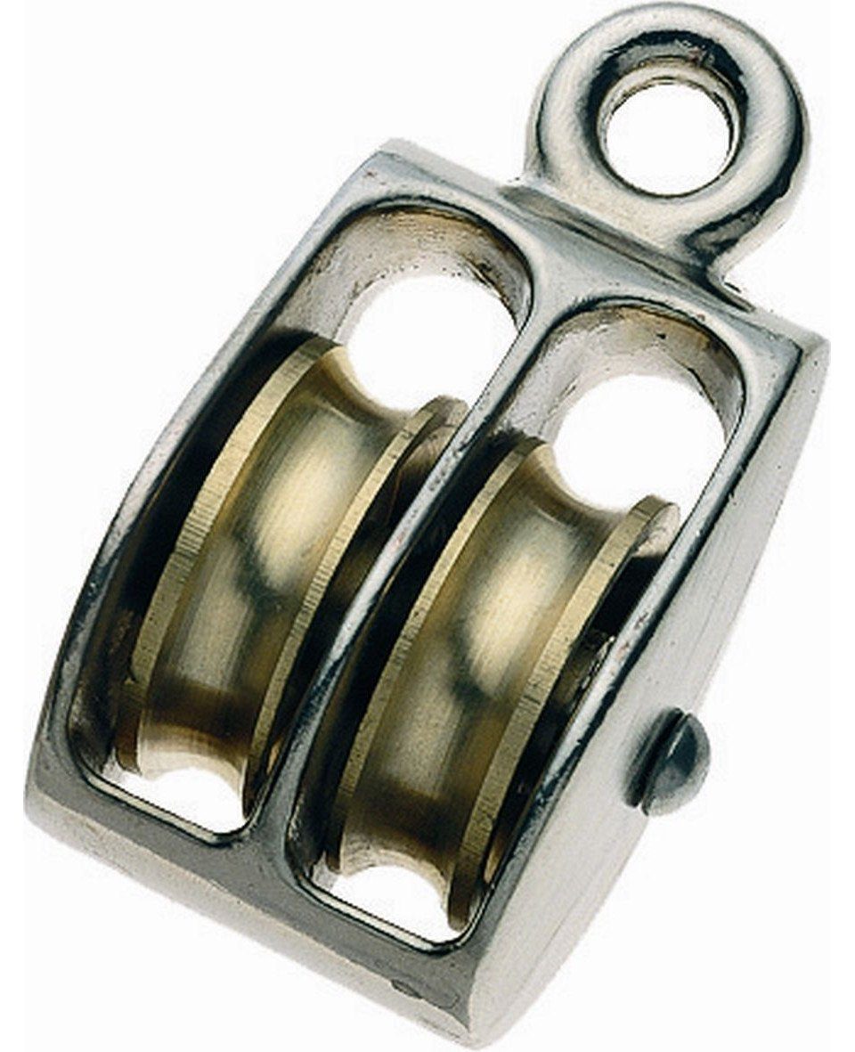 Blockseilrolle aus vernickeltem Stahl, doppelt, mit Umlenkrollen aus Messing. Für Seile bis 10 mm Ø.