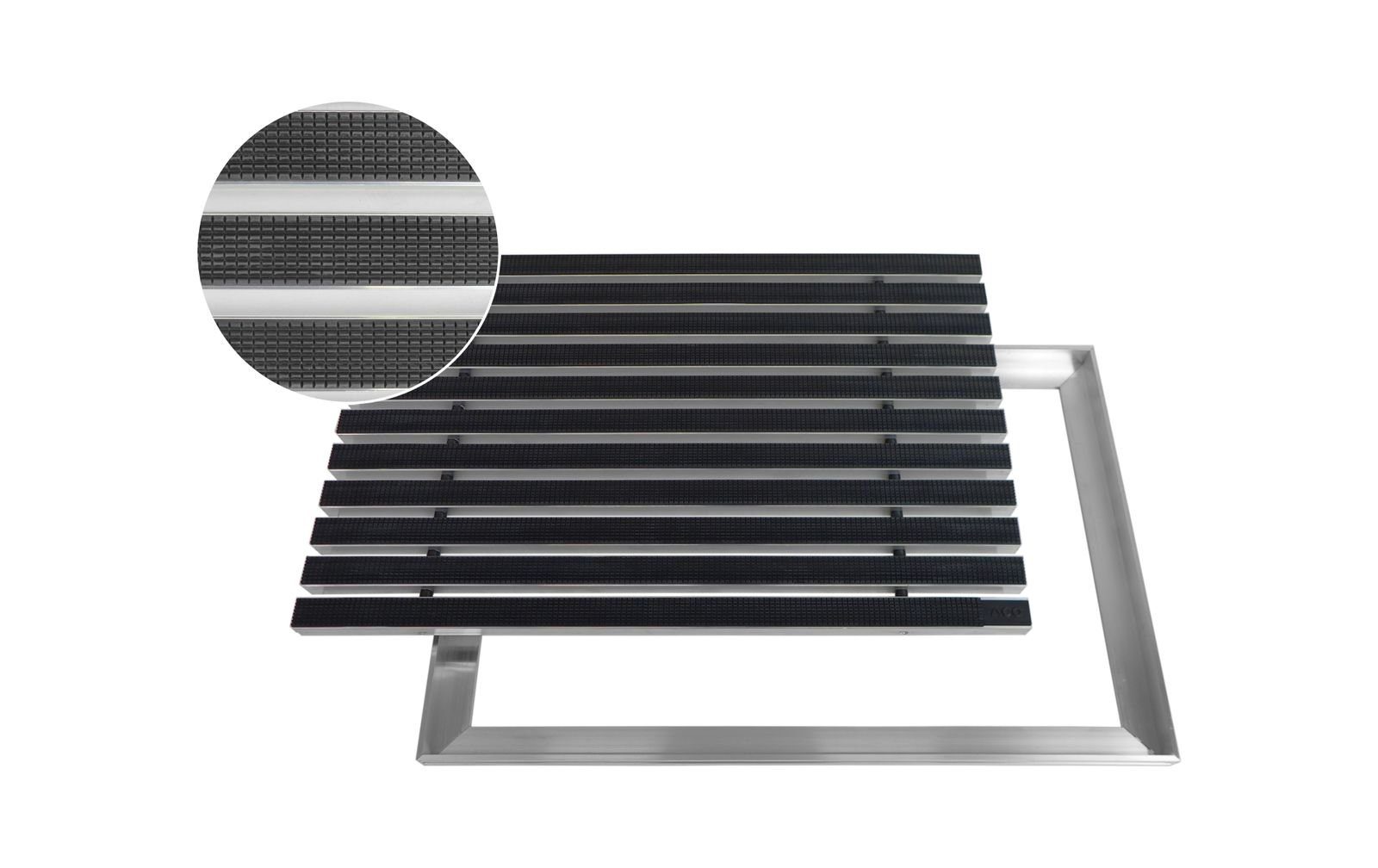 Die ACO Eingangsmatte liegt rutschsicher im Rahmen und wird beim Verlegen ebenerdig in den Boden eingelassen, dadurch ist eine schwellenlose Gestaltung vom Eingangsbereich problemlos möglich. Die aufrollbare und strapazierfähige Eingangsmatte mit Gummieinlagen wird empfohlen für den Innenbereich und Außenbereich mit einer normalen bis starken Belastung. Der Schuhabstreifer nimmt besonders gut Feuchtigkeit und Schmutz auf und hat rutschhemmende Eigenschaften (R13) nach DIN 51130.