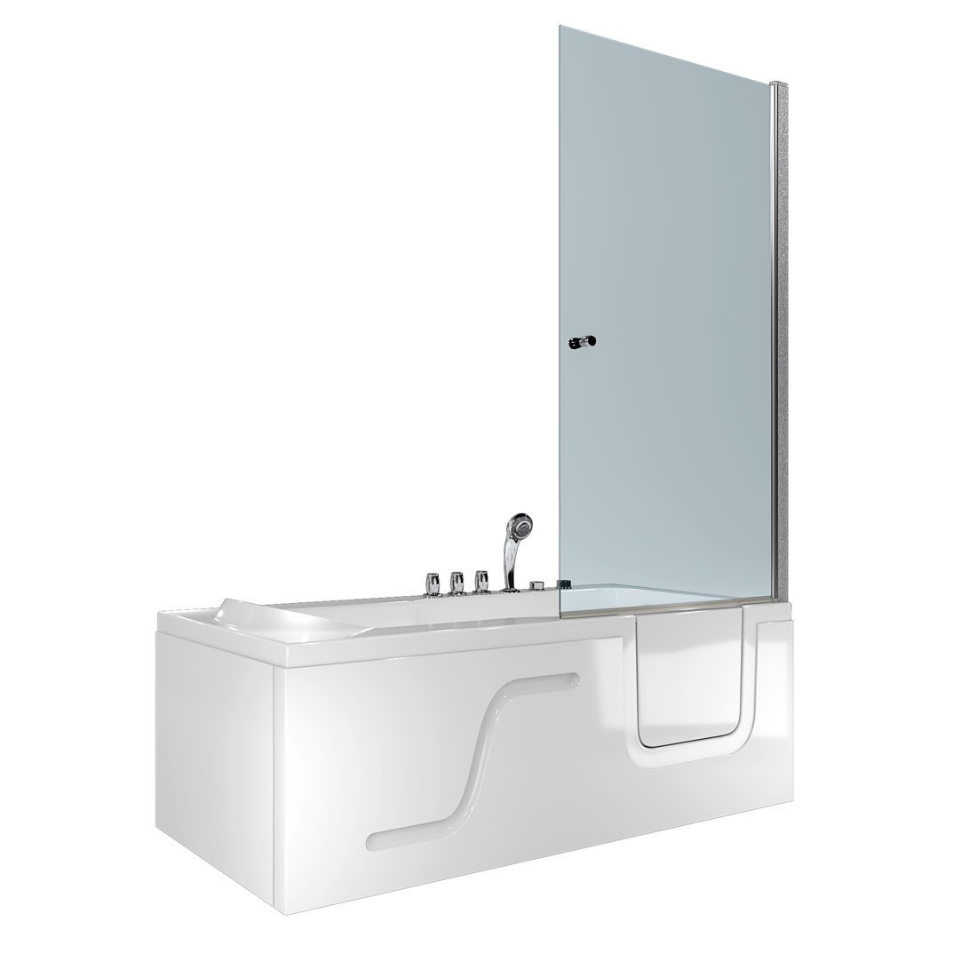 Ausstattung | Höhenverstellbare Füße, Wannne mit Einstiegstür, 5 Wasser-Massage-Düsen, Handbrause |