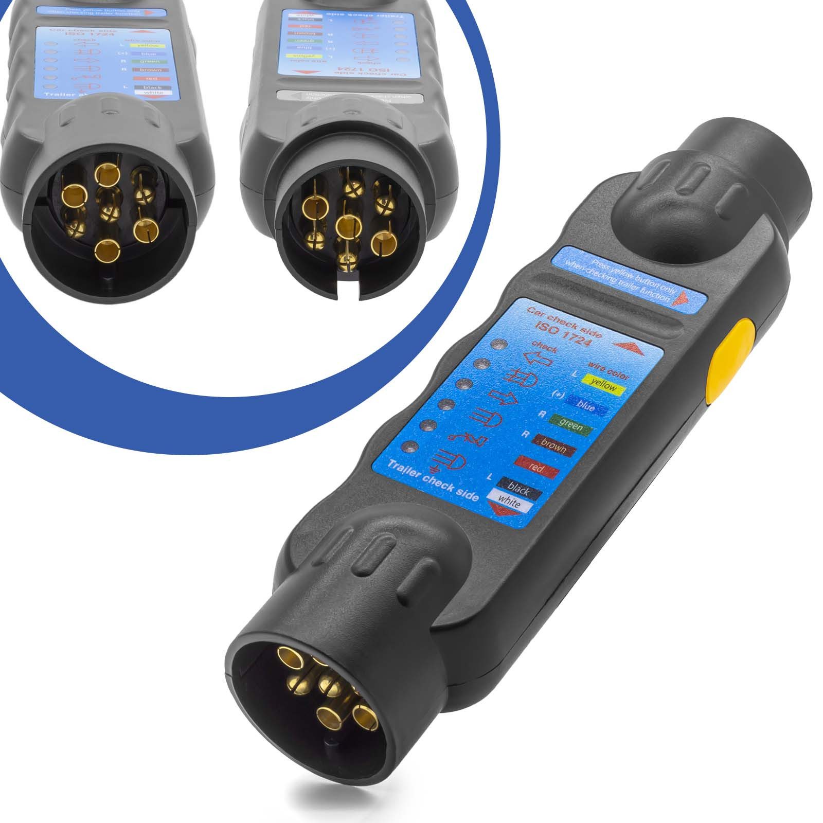Dieser Adapter ist ein Beleuchtungs- und Kabeltester für Anhänger und Zugfahrzeuge. Unser Testgerät gewährleistet schnellstes und einfachstes Suchen von Kabelleitungsdefekten an Anhängern sowie an Zugfahrzeugen. Defekte Kabelfarben werden vom Gerät durch LED's angezeigt. Es können alle 7-polige Dosen und Stecker geprüft werden.