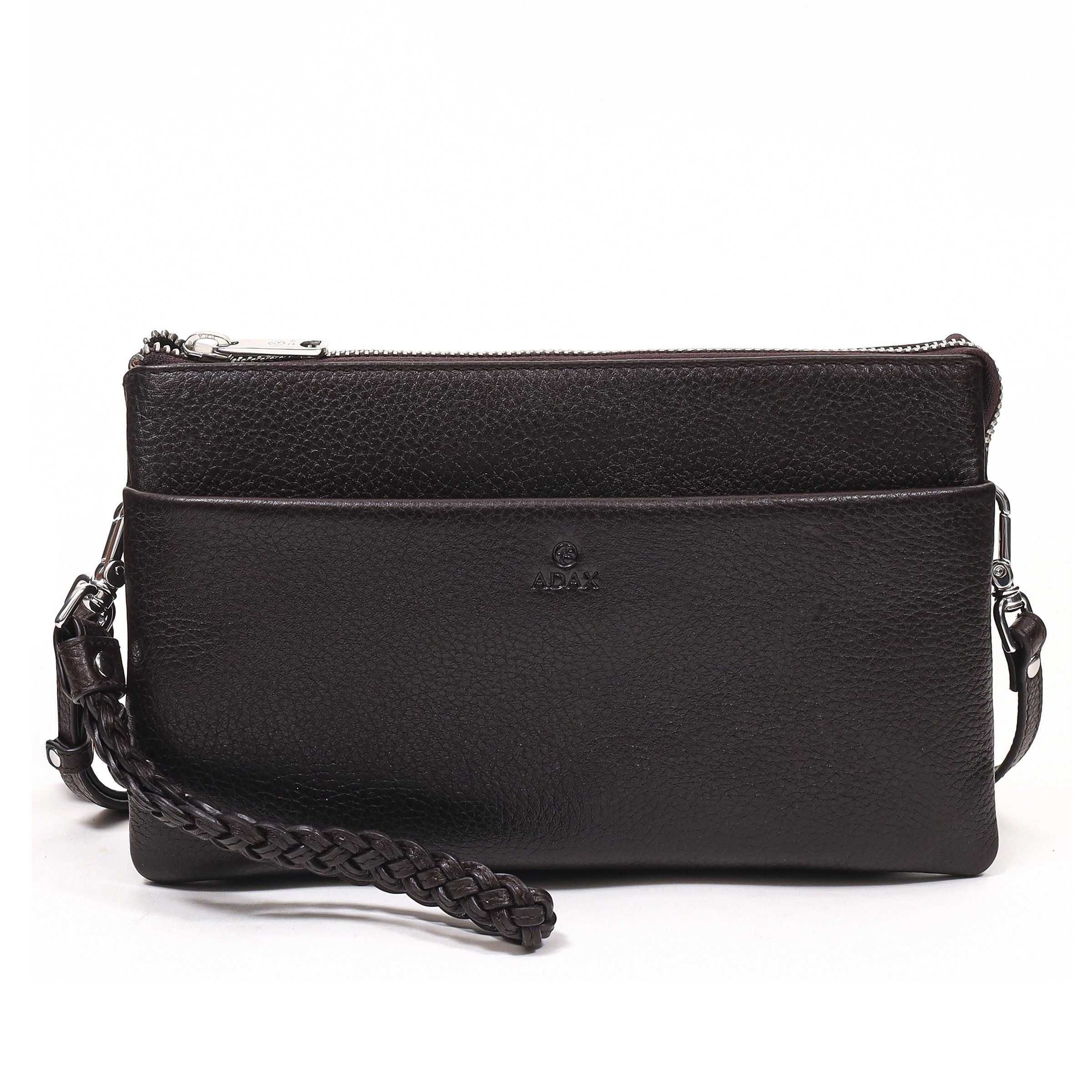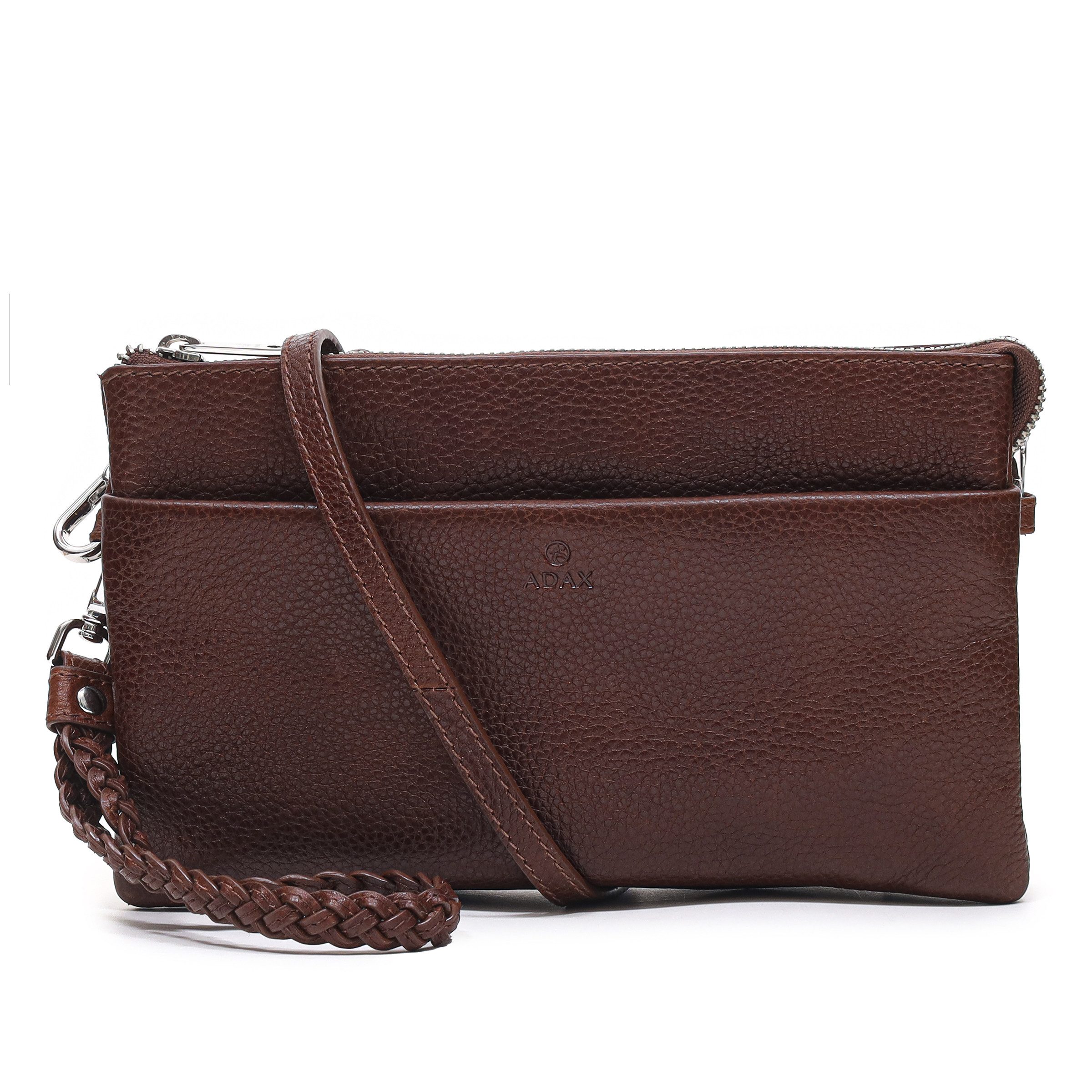 Ausstattung: - Kalbleder - Versilberte Metallteile - Abnehmbare, geflochtene Handschlaufe - Reversibler, verstellbarer Schulterriemen (90-188 cm) - Zentralreißverschluss - Vier Innenfächer, davon eins mit Reißverschluss, eins mit Steckfach, zwei mit jeweils vier Kartenfächern - Zusätzliches Mittelstegfach mit Reißverschluss - Vortasche mit Reißverschluss
