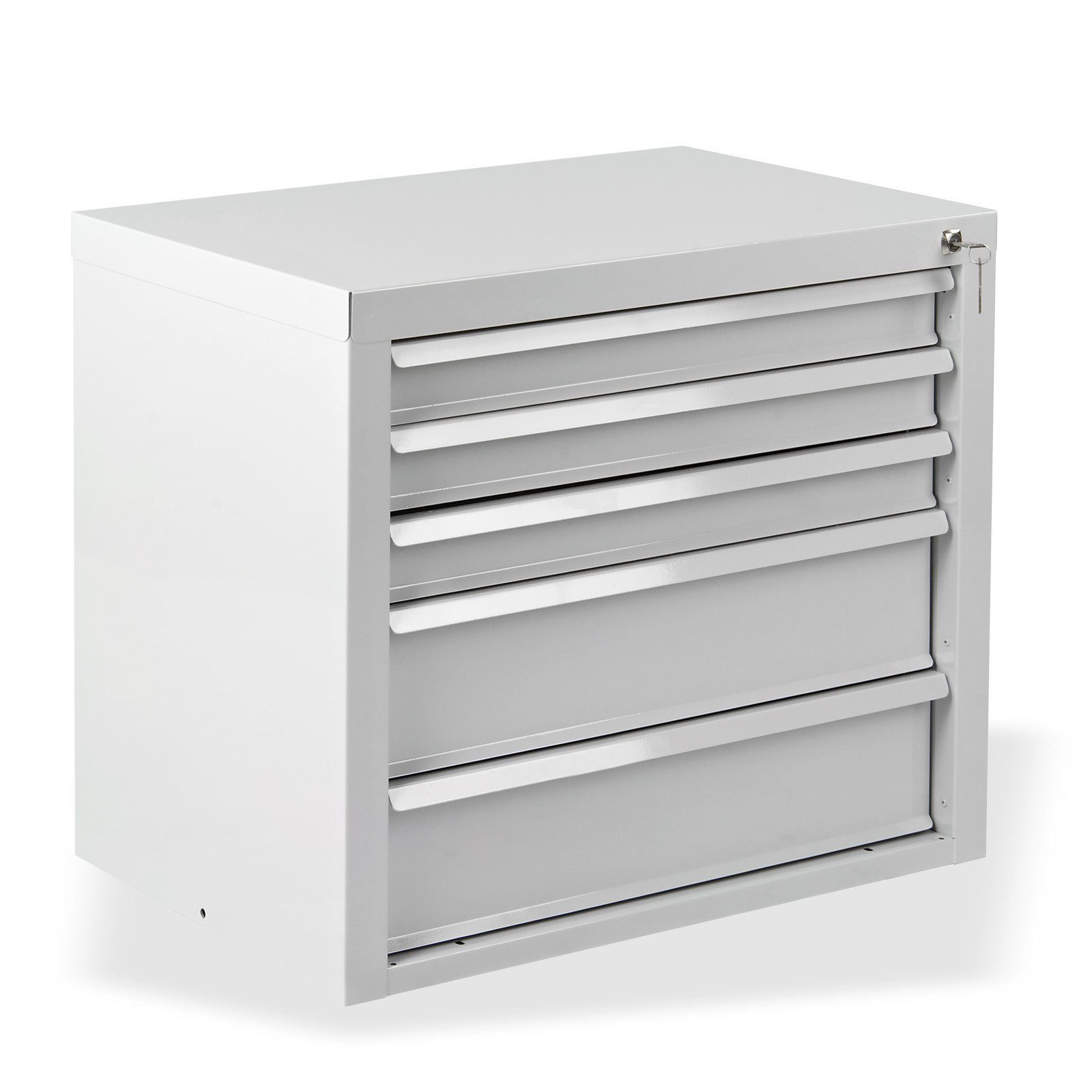 Mit seinen fünf Schubladen, davon drei kleinere und zwei größere, bietet der Schubladenschrank ausreichend Stauraum für all Ihre Arbeitsutensilien. Jede Schublade ist mit kugelgelagerten Vollauszügen ausgestattet und kann bis zu 40 kg belastet werden, sodass auch schwere Gegenstände sicher verstaut werden können.