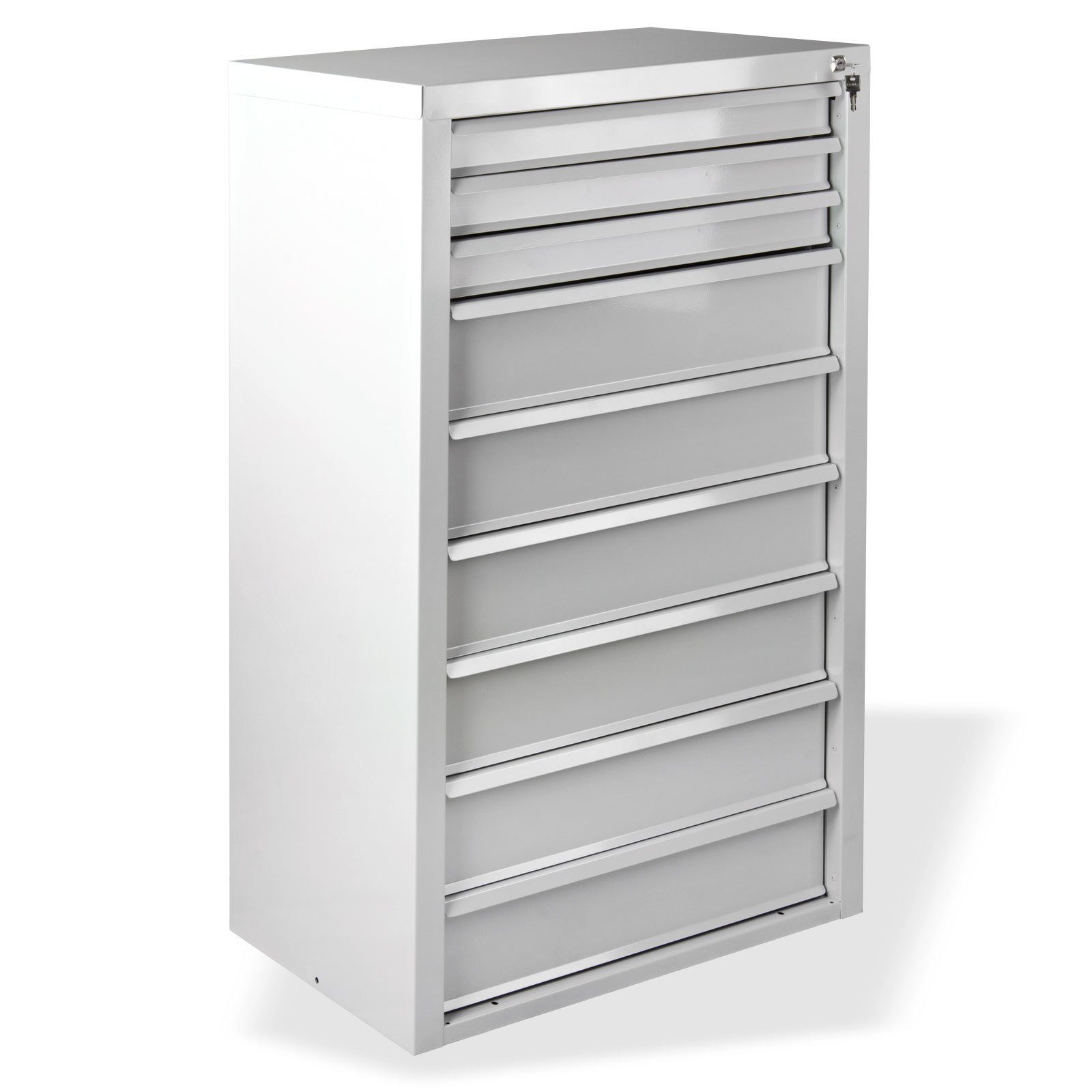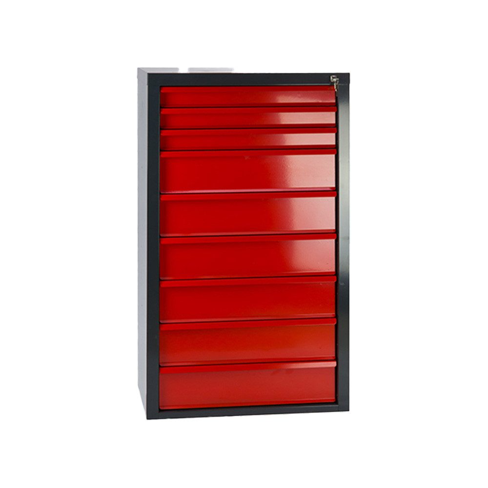 Mit seinen neun Schubladen, davon drei kleinere und sechs größere, bietet der Schubladenschrank ausreichend Stauraum für all Ihre Arbeitsutensilien. Jede Schublade ist mit kugelgelagerten Vollauszügen ausgestattet und kann bis zu 40 kg belastet werden, sodass auch schwere Gegenstände sicher verstaut werden können.