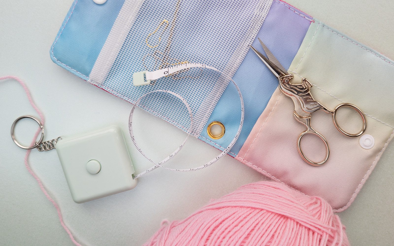 Das durchscheinende Fach mit Klettverschluss bewahrt alle Deine Accessoires sicher auf. So hast Du Maschenmarkierer, Nähnadel und Co. immer an ihrem Platz und auf einen Blick griffbereit. Mit der goldenen Öse kannst Du das Etui an jedem Haken befestigen oder in Deine Tasche einhängen.