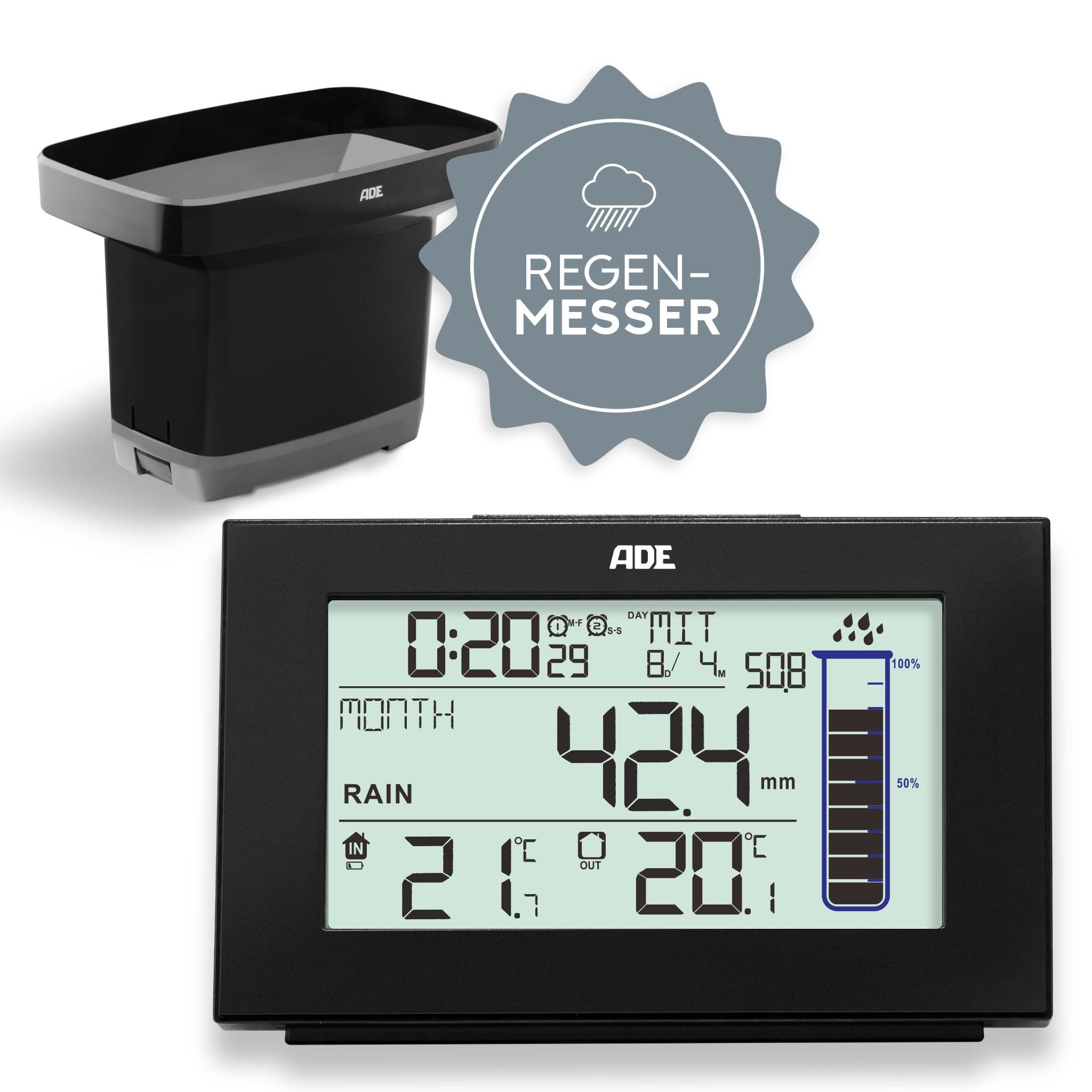 Besondere Merkmale | digital, 2-tlg. mit Auffangbehälter, Niederschlagsmesser, DCF-Funkuhr |