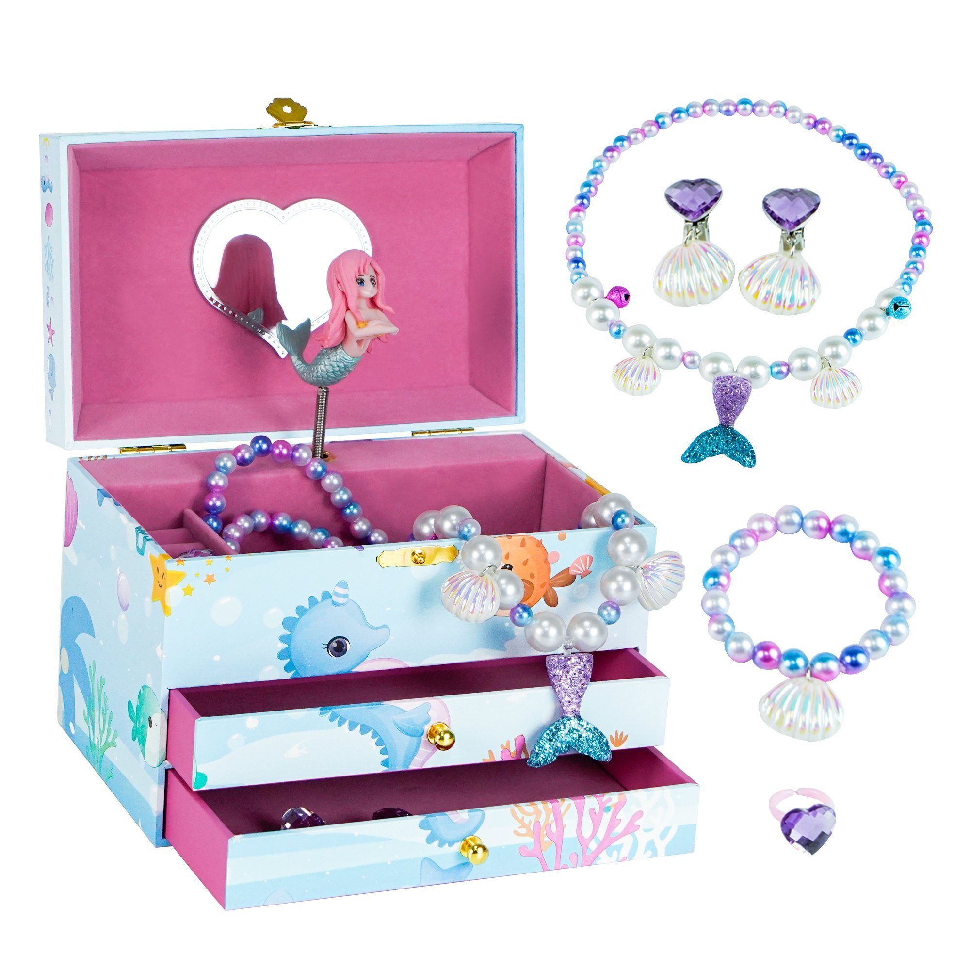 Spieluhr: Das Design der Ozean-Meerjungfrau-Tarnung, das Design der Ozean-Elfen-Tarnung, die Kombination aus rotierender und musizierender Meerjungfrau und einem Satz Muschelschmuck können den Kindern ein strahlendes Lächeln ins Gesicht zaubern und ihre Fantasie anregen; mit Samt Das dreischichtige Aufbewahrungsdesign ist groß genug, um Kinderschmuck aufzubewahren. Dies ist ein tolles Geburtstags- oder Weihnachtsgeschenk für Kinder.