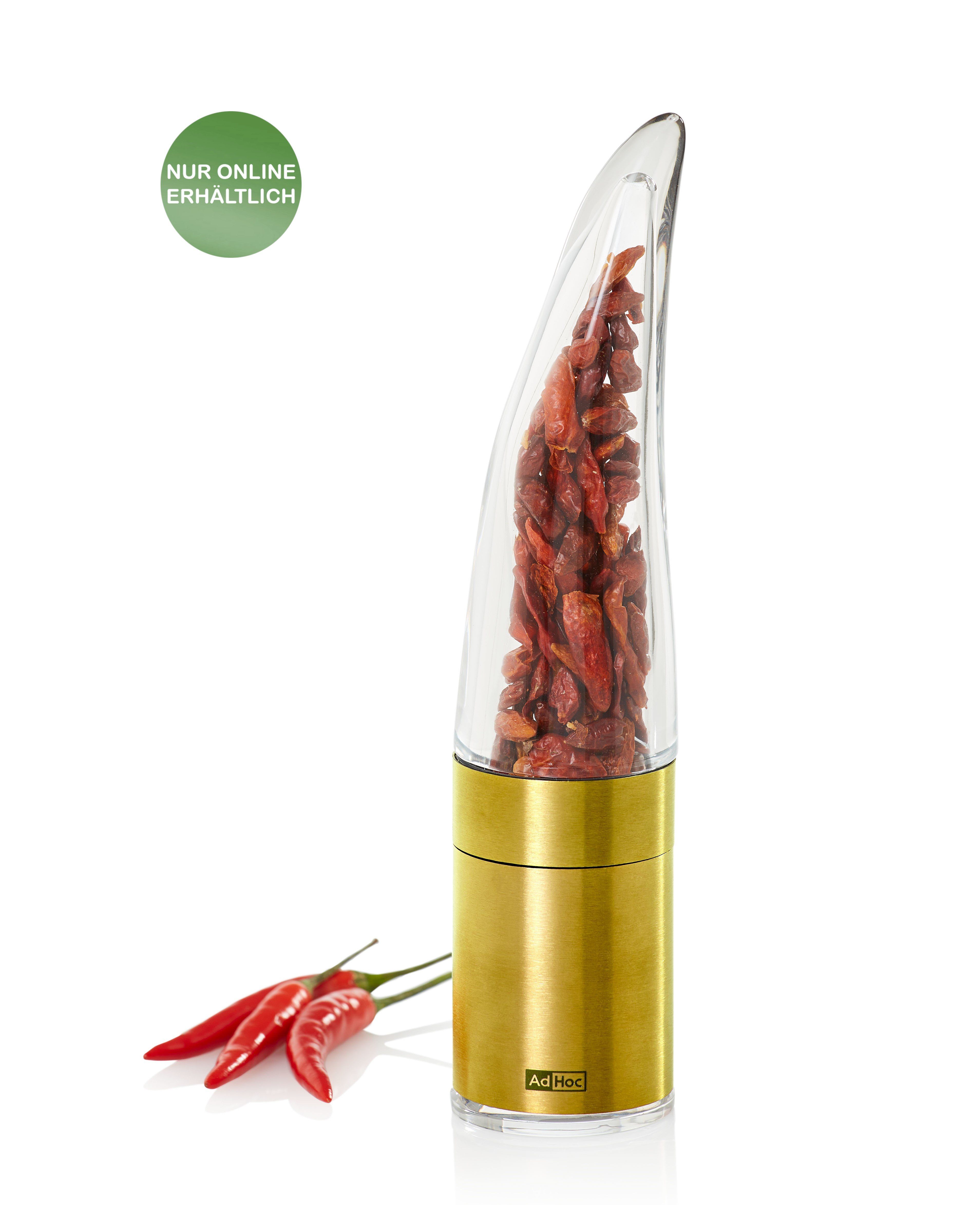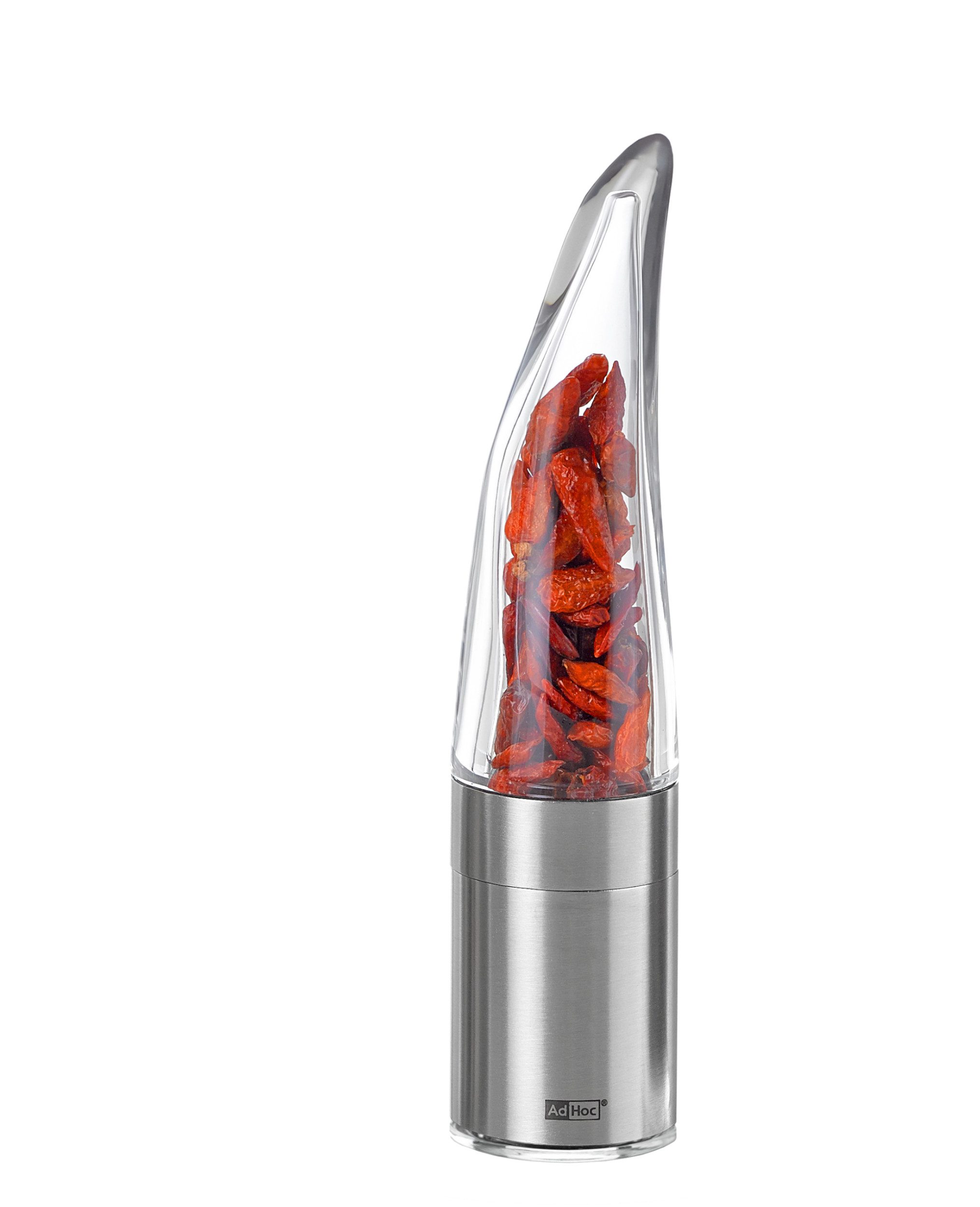 PEPE ist der innovative Chilischneider von AdHoc. Die individuelle Gestaltung lässt sofort die Funktion erkennen: „For Chilis only!“ Das elegante Acryl-Edelstahl-Design, für den freien Blick auf die Chilis, macht PEPE zum echten Eye-Catcher auf dem Tisch. Er verfügt über das patentgeschützte original AdHoc SchneidWerk®, das für das optimale Zerkleinern von getrockneten Chilis samt Kerne ausgerichtet ist. Durch die feine Dosierung führt der Umgang mit Chilis zu keinen unliebsamen Überraschungen mehr. Die Aromaschutzkappe sorgt dafür, dass das geschnittene Chilipulver letztendlich nur dahin kommt, wo Sie es wirklich hin haben möchten, nämlich auf die zu würzende Speise.