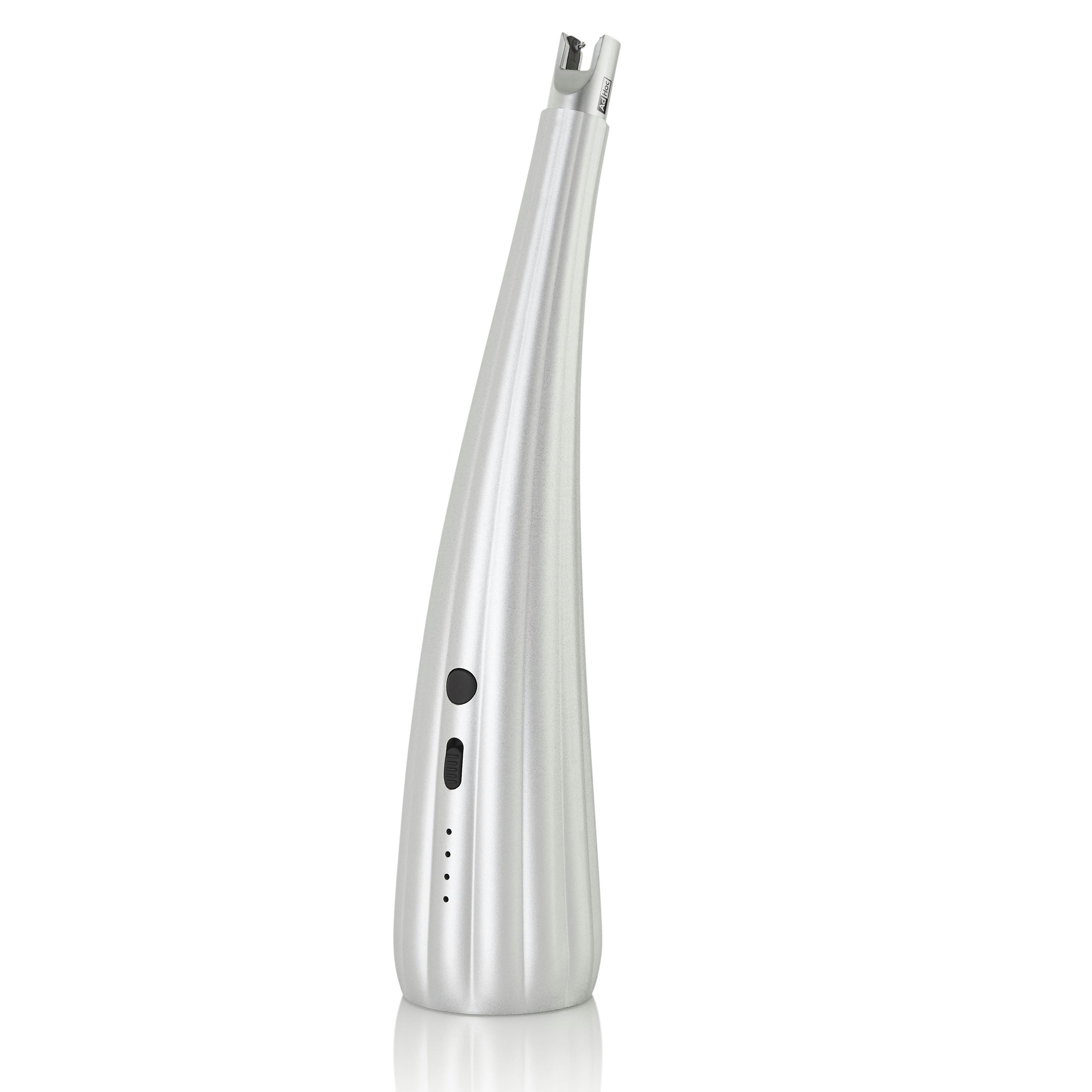 Wenn zwei gegensätzlich geladene Elektroden aneinander gebracht werden, entsteht ein Lichtbogen und siehe da, Kerze & Co. sind schnell entflammt. Doch nicht nur das: Das von Gabriele Kaltenbach designte Accessoire beschreibt einen leichten Bogen, der dem aufrecht stehenden Feuerzeug eine skulpturale Form verleiht.