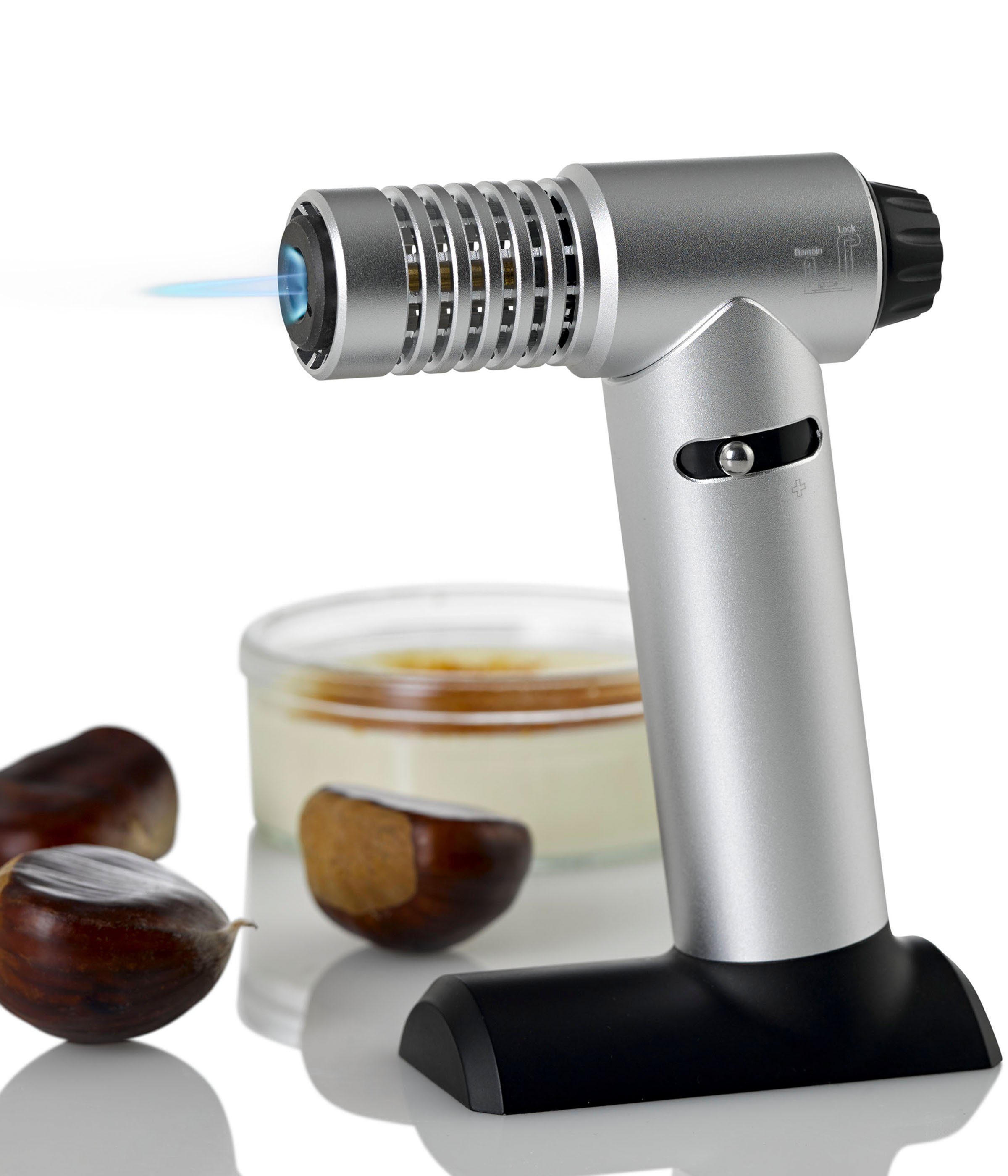 Dank seiner langfristig zuverlässigen Piezo-Zündung arbeitet der BRULÉE dauerhaft und sicher. Apropos Sicherheit: Eine Sicherungsverriegelung verhindert eine unbeabsichtigte Zündung des nachfüllbaren Brenners und der ausladende Fuß macht den BRULÉE besonders standfest, so ist er kurzerhand auf der Arbeitsplatte zu platzieren. Kreatives Experimentieren mit variantenreichen Zutaten wird mit BRULÉE zum einladenden Vergnügen.