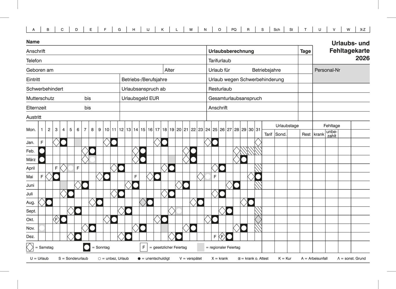 Die ADINA Urlaubs- und Fehltagekarte A5 ist die ideale Lösung zur übersichtlichen Erfassung von Urlaubs- und Krankheitstagen Ihrer Mitarbeiter. Auf einer handlichen Karte im Format A5 (210 x 148 mm) lassen sich alle Abwesenheiten übersichtlich und klar dokumentieren. Die praktische Monatstage-Einteilung ermöglicht eine schnelle Eintragung und sofortige Übersicht über den gesamten Jahresverlauf. Gedruckt in schwarz/weiß auf hochwertigem Karton sorgt die klare Gestaltung für gute Lesbarkeit und eine einfache Handhabung im täglichen Gebrauch. Ob im Büro, in der Personalabteilung oder in kleinen und mittelständischen Betrieben – mit den ADINA Urlaubs- und Fehltagekarten behalten Sie jederzeit den Überblick über Urlaubsansprüche, Krankheitstage oder andere Abwesenheiten Ihrer Mitarbeiter. Das Set enthält 10 Stück im handlichen A5-Format und eignet sich ideal zur strukturierten Personalverwaltung. Ob als Urlaubskarte A5, Fehltagekarte, Mitarbeiter Abwesenheitsübersicht oder Urlaubsplaner Personalabteilung – die ADINA Urlaubs- und Fehltagekarte ist ein praktisches und unverzichtbares Hilfsmittel für die effiziente Organisation im Unternehmen.