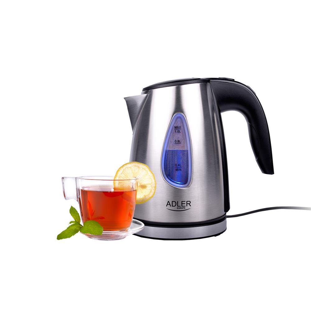 Der klassische 1-Liter-Wasserkocher ist in jeder Küche und jedem Büro nützlich. Aus Sicherheitsgründen ist er mit einer Abschaltautomatik ausgestattet, die den Wasserkocher vor dem Trockenkochen schützt und den Wasserkocher sofort nach dem Kochen des Wassers abschaltet. Der Wasserkocher ist mit einem Filter ausgestattet, der Kalk aufhält, was den Geschmack und die Qualität des Wassers verbessert. Seine Funktionalität wird durch einen stabilen Sockel und eine helle Wasserstandsanzeige erhöht. Der Wasserkocher ist aus Edelstahl gefertigt und mit einem leistungsstarken Heizelement mit 1630 W ausgestattet, was ihn zu einem Sprintmeister im Wasser kochen macht. Das moderne Design und das silberne Gehäuse wird durch eine LED ergänzt, die darüber informiert, dass das Wasser gerade gekocht hat.