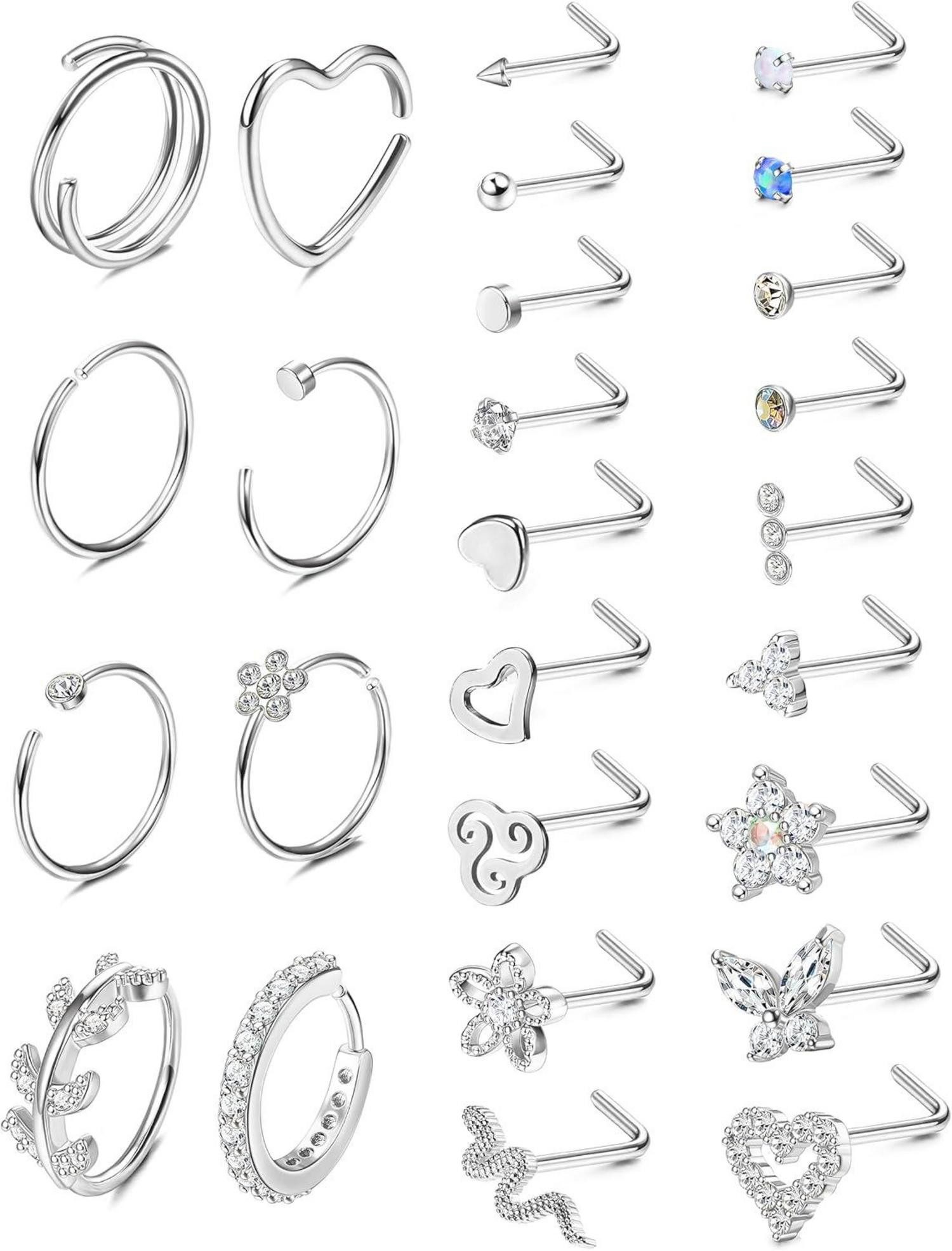 Das 26-teilige Nasenpiercing Set aus hochwertigem Chirurgenstahl und glänzendem Zirkonia bietet eine Auswahl an 18 Nasensteckern und 8 Nasenringen in verschiedenen Stilen, darunter CZ, Schlange, Schmetterling, Herz und mehr. Mit einer Stärke von 20G (0,8 mm) und einer Stablänge von 6 mm sind sie einfach anzubringen und angenehm zu tragen.