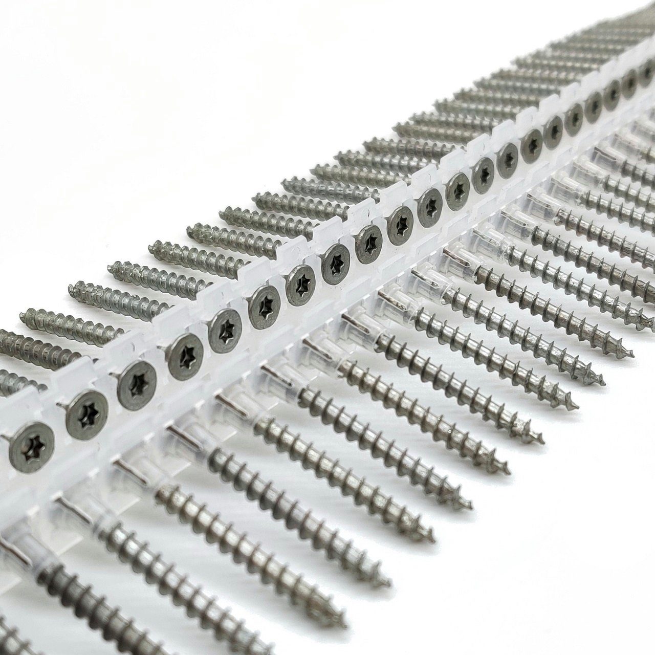 Zusammen mit dem Wellenprofil verringert die CUT-Spitze nicht nur die Spaltwirkung des Holzes, sondern vermeidet auch Vorbohrungen in den meisten Holzarten. Die Schraube lässt sich schnell und sicher verarbeiten, auch auf glatten Holzoberflächen.