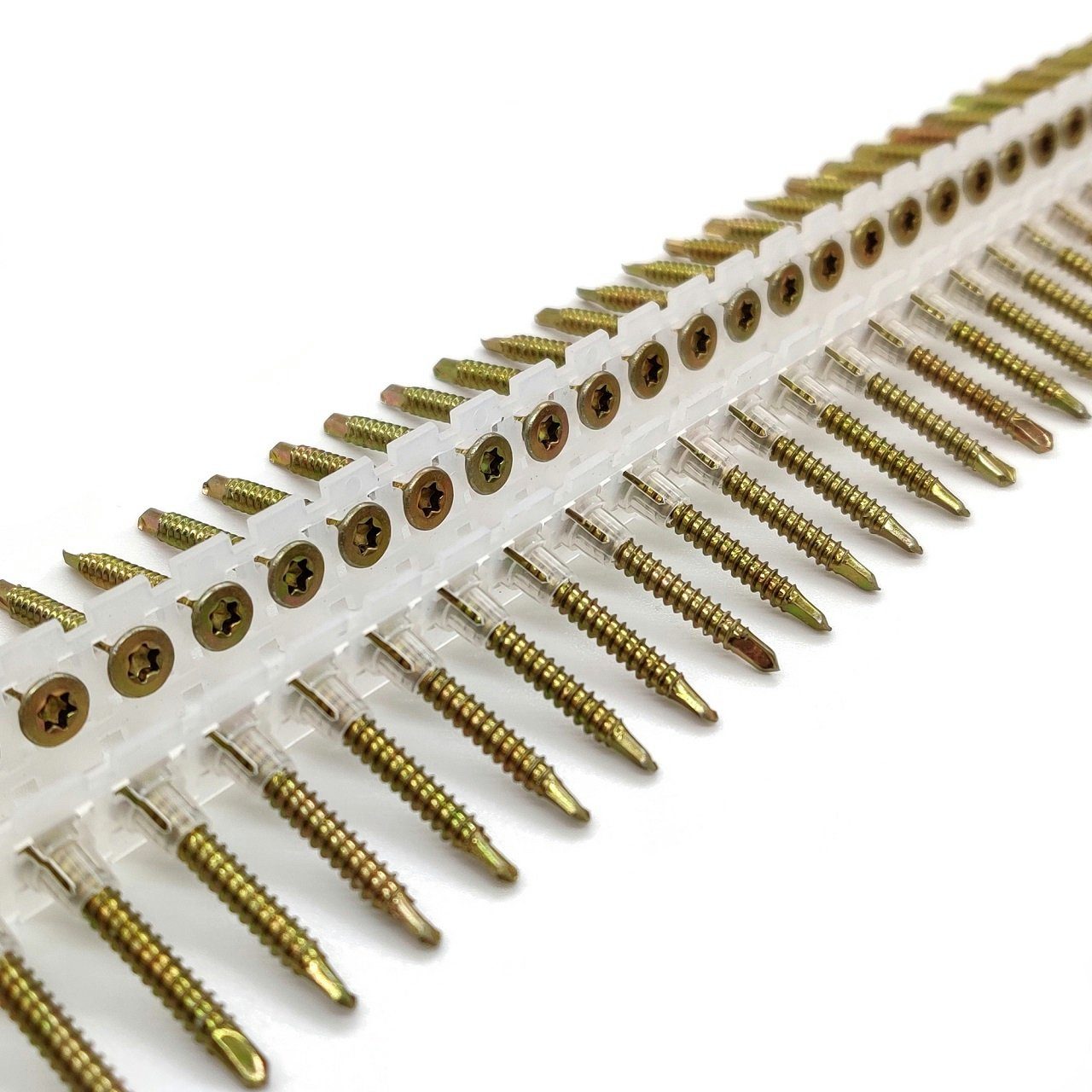 Magazinschrauben für die Befestigung von OSB Platten auf Metallständerwerken Mit diesen magazinierten OSB Ständerwerkschrauben verschraubst du OSB Platten super schnell und einfach auf deinem Metallständer. Die praktische Bohrspitze macht lästiges Vorbohren der Unterkonstruktion überflüssig, da sie leicht und sicher den Metallständer durchdringt.