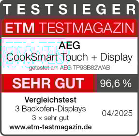 Das AEG CookSmart Touch + Display erzielt im Vergleichstest des „ETM TESTMAGAZINS“ mit zwei weiteren Backofen-Displays das Gesamtergebnis „sehr gut (96,6 %)“. Das „sehr gute“ Gebrauchserlebnis ist im Vergleich am besten: Das Ansprechverhalten, die Gebrauchsparameter, die Menüs, die Sicherheit und die Smart Home Funktionen sind jeweils „sehr gut“. Auch die Garassistenz ist hervorragend. Außerdem ist das Display „sehr gut“ ablesbar und bietet eine sehr hohe Qualität von Grafiken & Co. Insgesamt ist das Modell der „TESTSIEGER“.