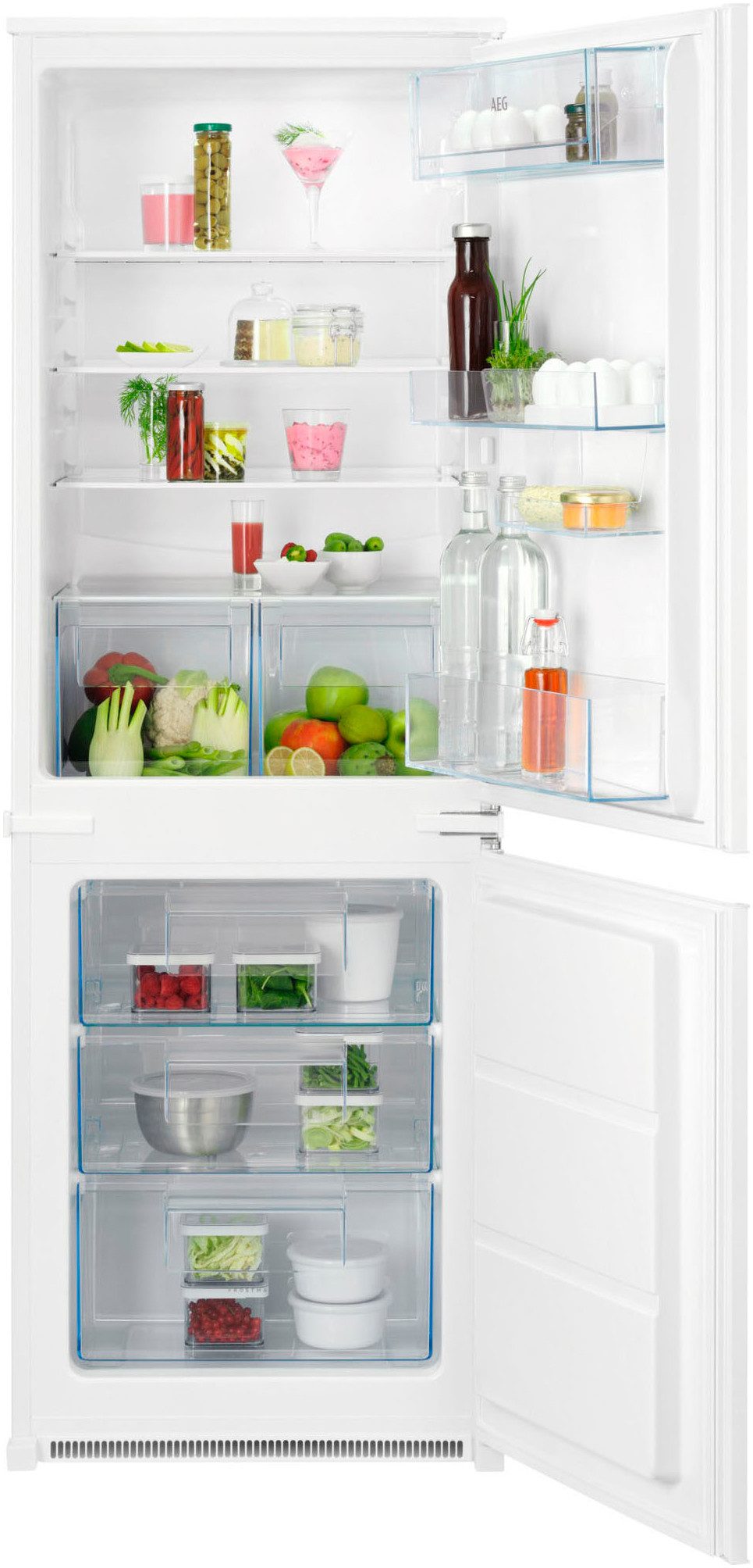 Die integrierbare Einbaukühlgefrierkombination »TS5S161ES« ist von der Marke AEG. Das Gerät bietet ausreichend Platz für deinen Einkauf durch seine Maße von 54,8 x 157,2 x 54,9 cm (B/H/T) und das Gefriervolumen von 72 l und Kühlvolumen von 161 l. Das Modell arbeitet mit einem Betriebsgeräusch von 35 dB. Die Bildung von Eis wird durch die LowFrost-Technologie vermindert – so bildet sich erheblich weniger Eis als bei herkömmlichen Geräten. Das Abtauen gelingt daher deutlich schneller und verbraucht dabei weniger Strom. Das Gerät besitzt drei Gefrierschubladen und zwei Gemüseschubladen. Das innen installierte Display zeigt die genaue Temperatur im Gerät an. Die vier Ablageflächen aus Glas, darunter drei höhenverstellbar, bieten viel Platz für Lebensmittel. Zusätzliche Flexibilität bei der Aufbewahrung bieten die vier Türablagen. Die Frostmatic- und Schnellgefrier-Funktionen sorgen dafür, dass sich die Lebensmittel besonders schnell kühlen und einfrieren lassen. Wenn die Tür zu lange offen steht oder eine Fehlfunktion vorliegt, macht die Einbaukühlgefrierkombination über ein akustisches Warnsignal darauf aufmerksam. Durch die LED-Innenbeleuchtung findet man außerdem immer schnell, wonach man sucht. Für diejenigen, die auf der Suche nach einer Einbaukühlgefrierkombination sind, ist die »TS5S161ES« von AEG eine gute Wahl.
