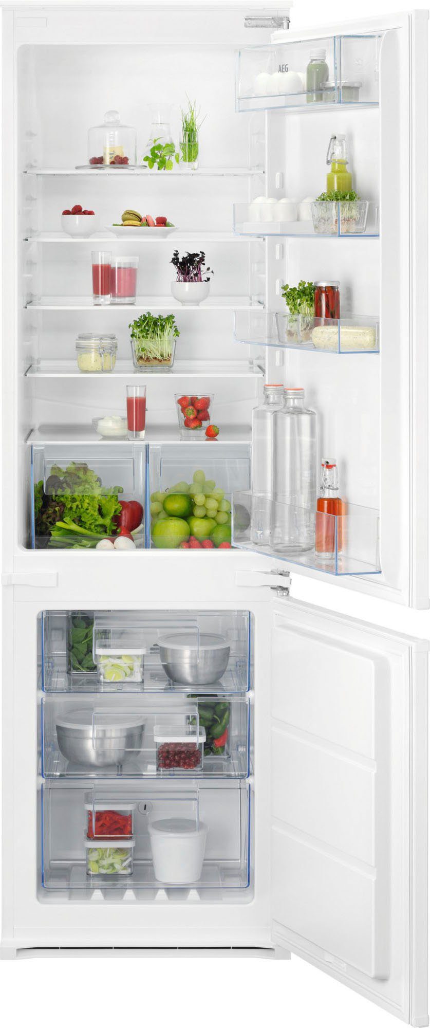Die integrierbare Einbaukühlgefrierkombination »TSC6N183ES« ist von der Marke AEG. Bei einem Gefriervolumen von 62 l und Kühlvolumen von 195 l betragen die Maße des Modells 54 x 177,9 x 54,9 cm (B/H/T). Das Modell arbeitet mit einem Betriebsgeräusch von 35 dB. Eisbildung wird durch die No Frost-Funktion verhindert – so muss das Gerät nie wieder abgetaut werden. Drei Gefrierschubladen und zwei Gemüseschubladen stehen zur Verfügung, um den Einkauf zu verstauen. Auf dem innen installierten Display kann die genaue Temperatur im Gerät abgelesen werden. Die Einbaukühlgefrierkombination hat fünf Ablageflächen aus Glas, darunter vier höhenverstellbar, die viel Platz für Lebensmittel bieten. Zusätzliche Variabilität bei der Aufbewahrung bieten die vier Türablagen. Durch die Schnellgefrier-Funktion lassen sich Nahrungsmittel besonders schnell kühlen und einfrieren. Bei offen stehender Tür meldet dies die Einbaukühlgefrierkombination mit einem optischen und akustischen Warnsignal. Eine perfekte Übersichtlichkeit hat man außerdem durch die LED-Innenbeleuchtung. Die »TSC6N183ES« von AEG ist eine Einbaukühlgefrierkombination, die mit ihren Features überzeugt und genug Platz für Nahrungsmittel aller Art bietet.