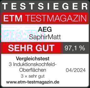 Der AEG SaphirMatt erzielt im Vergleichstest des „ETM TESTMAGAZINS“ mit zwei weiteren Induktionskochfeld-Oberflächen das Gesamtergebnis „sehr gut (97,1 %)“. Die Reinigung der Oberfläche von Speisen wie z. B. Ei, Milch, Öl, Nudeln und Reis gelingt hervorragend. Das Kochfeld übersteht mechanische Strapazen und hohe Temperaturen „sehr gut“. Insgesamt ist die Induktionskochfeld-Oberfläche der „TESTSIEGER“.