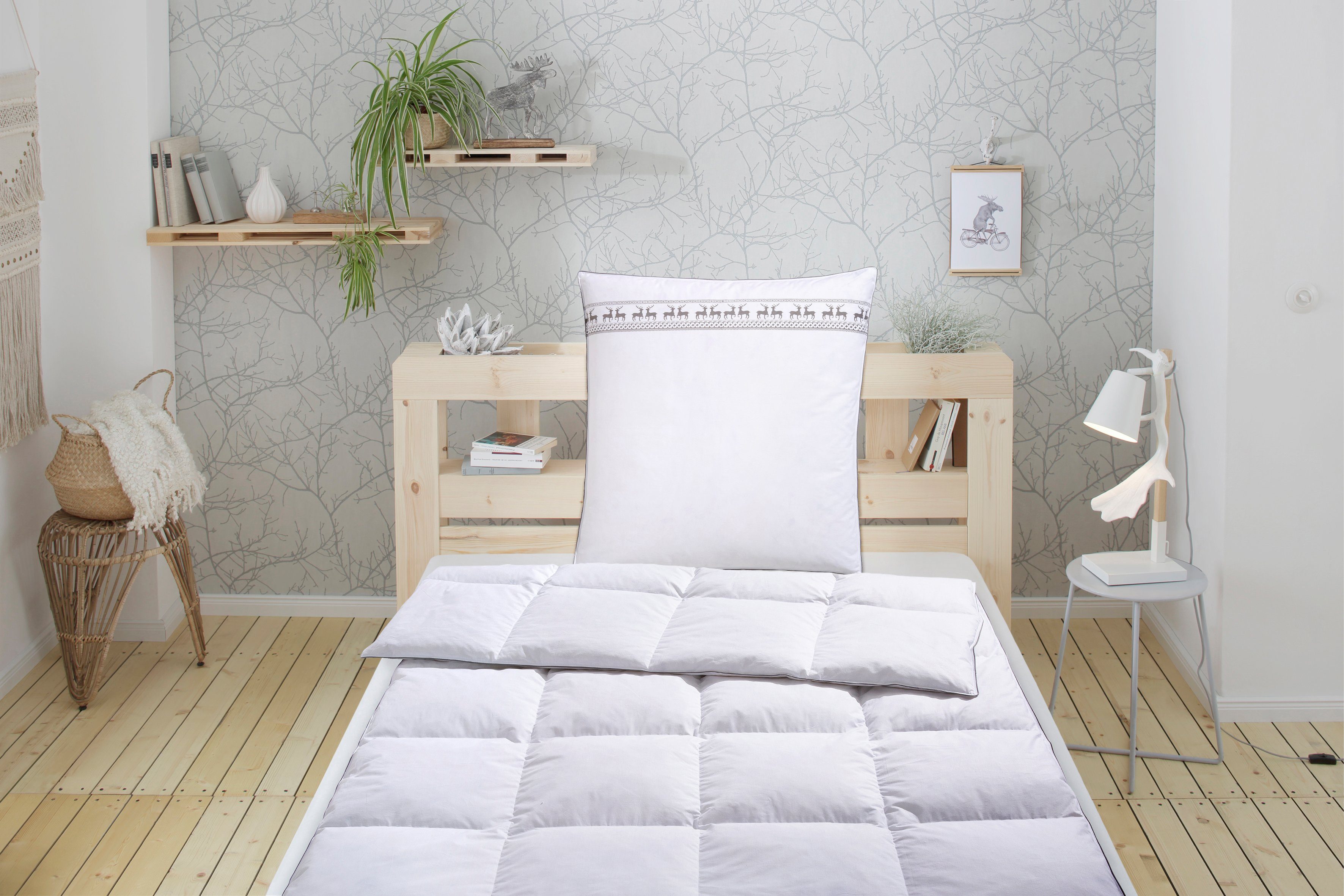 Materialzusammensetzung | Bettdecken Bezug: 100% Baumwolle. Kopfkissen Bezug: 100% Baumwolle. Bettdecken Füllung: 100% Entenfeder. Kopfkissen Füllung: 100% Entenfeder |