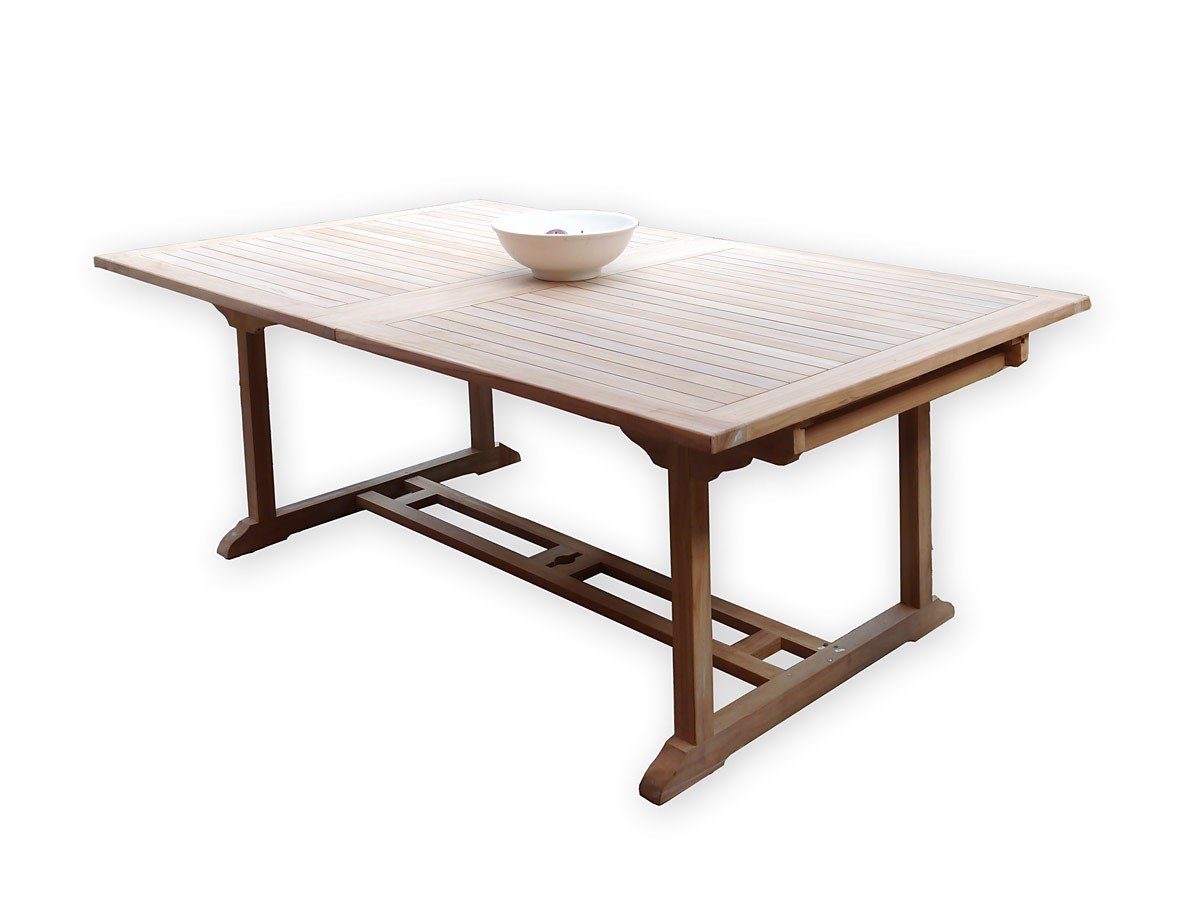 Der rechteckige Gartentisch ist aus massivem, witterungsbeständigen Teakholz gefertigt und lässt sich bis auf eine Длина von 300 cm ausziehen.