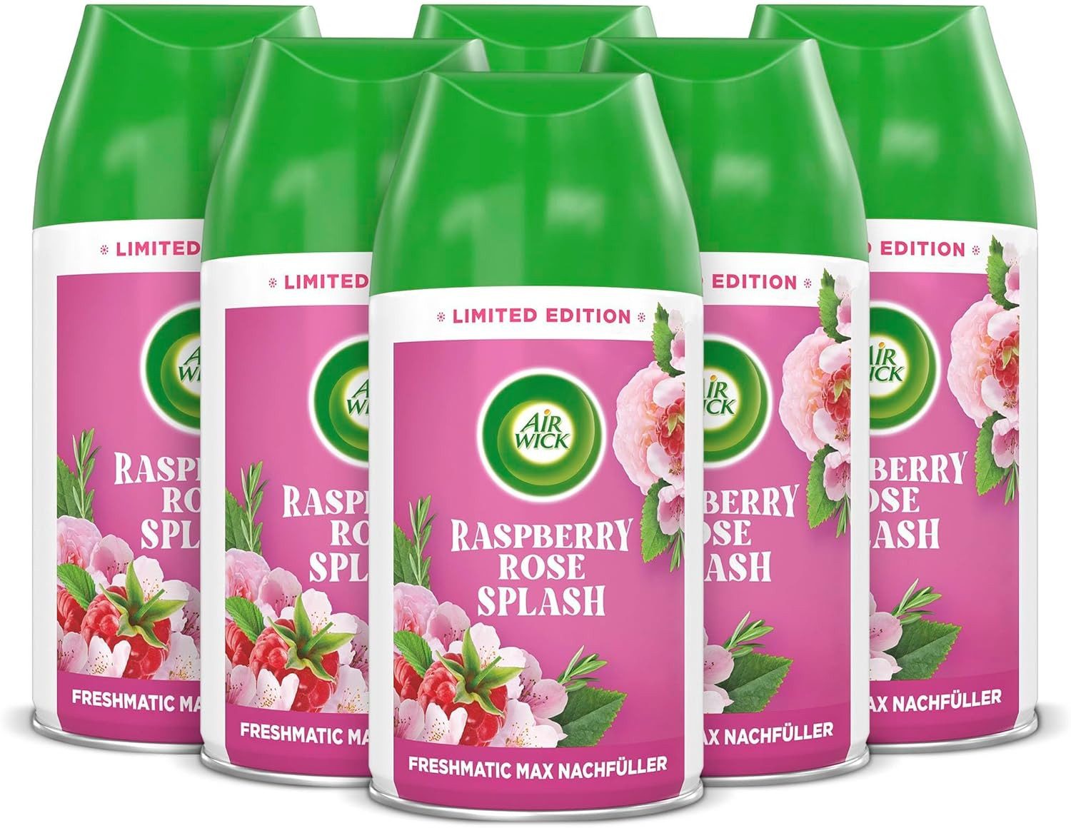 6 x 250ml Air Wick Nachfüller Raumspray für Air Wick Freshmatic Max / Duft: Raspberry Rose Splash / Mit ätherischen Ölen / Kompatibel mit den meisten handelsüblichen Geräten