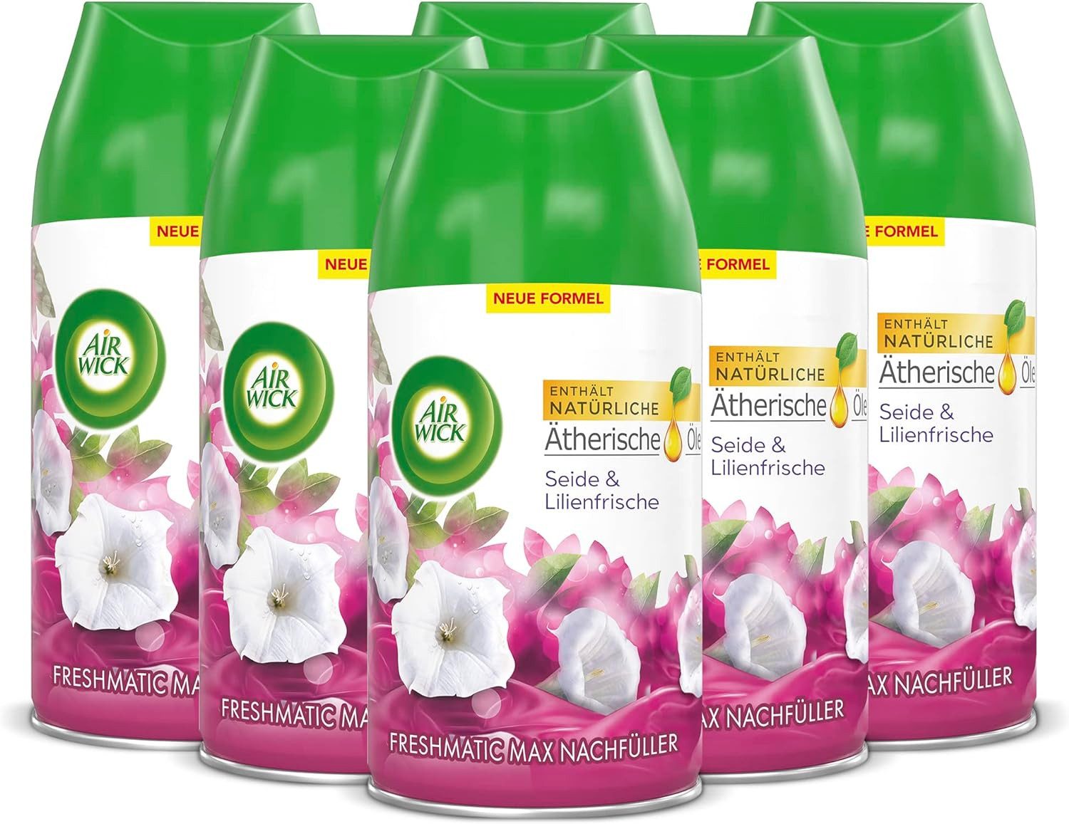 Lieferumfang: 6x 250ml Air Wick Nachfüller Raumspray für Air Wick Freshmatic Max / Duft: Seide und Lilienfrische / Kompatibel mit den meisten handelsüblichen Geräten