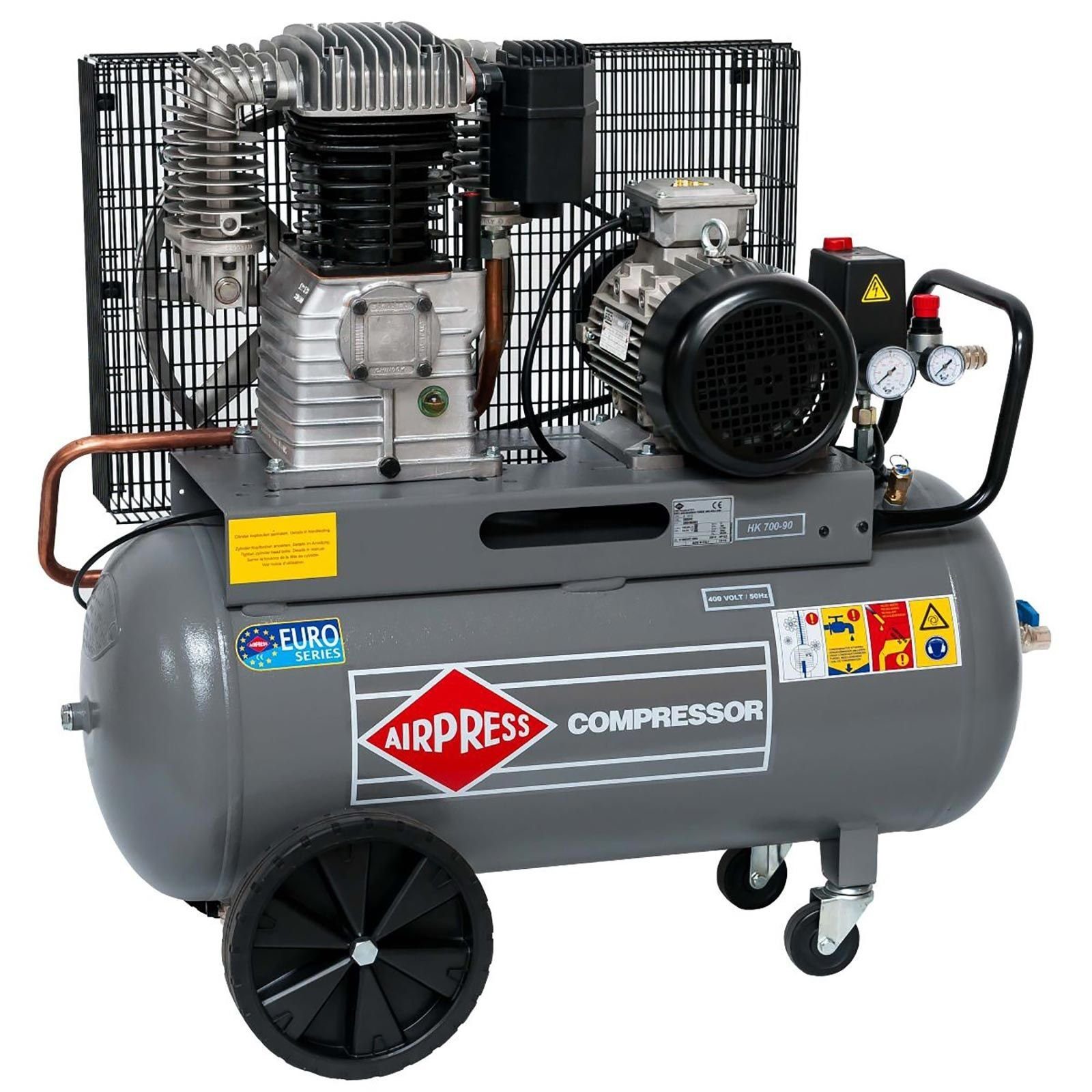 Leistungsstarker Kolbenkompressor mit Riemenantrieb, 90 l Kessel und 400 V Anschluss. Das Markengerät von Airpress verfügt über einen 5,5 PS starken Elektromotor der nach kürzester Zeit Druckluft bereitstellt. Ideal für den Betrieb von Druckluftwerkzeugen wie Schlagschrauber, Lackierpistolen, Tacker uvm. Für anspruchsvolle Aufgaben im Bereich Landwirtschaft, Werkstatt oder Baustelle.