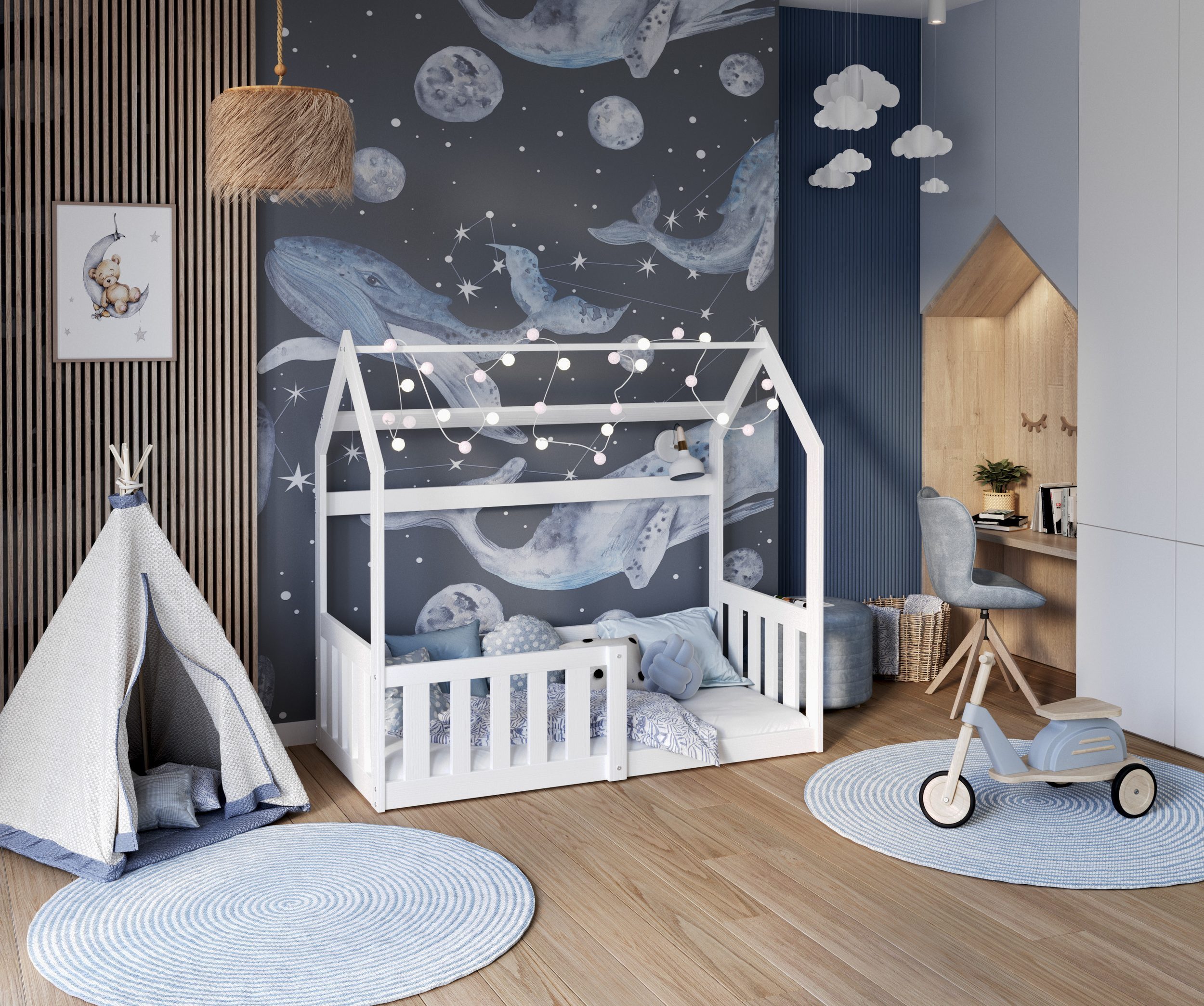 Das AJK meble Montessori Bodenbett ist die perfekte Wahl für das Kinderzimmer, inspiriert von der Montessori-Pädagogik. Dieses Bodenbett bietet Ihrem Kind Sicherheit und Geborgenheit dank des integrierten Rausfallschutzes. Hergestellt aus massivem Kiefernholz, ist es in den Farben Natur oder Weiß und in den Größen 80x160 cm und 80x190 cm erhältlich. Das Hausbett-Design macht das Bett nicht nur zu einem Schlafplatz, sondern auch zu einem fantasievollen Rückzugsort für Jungen und Mädchen.