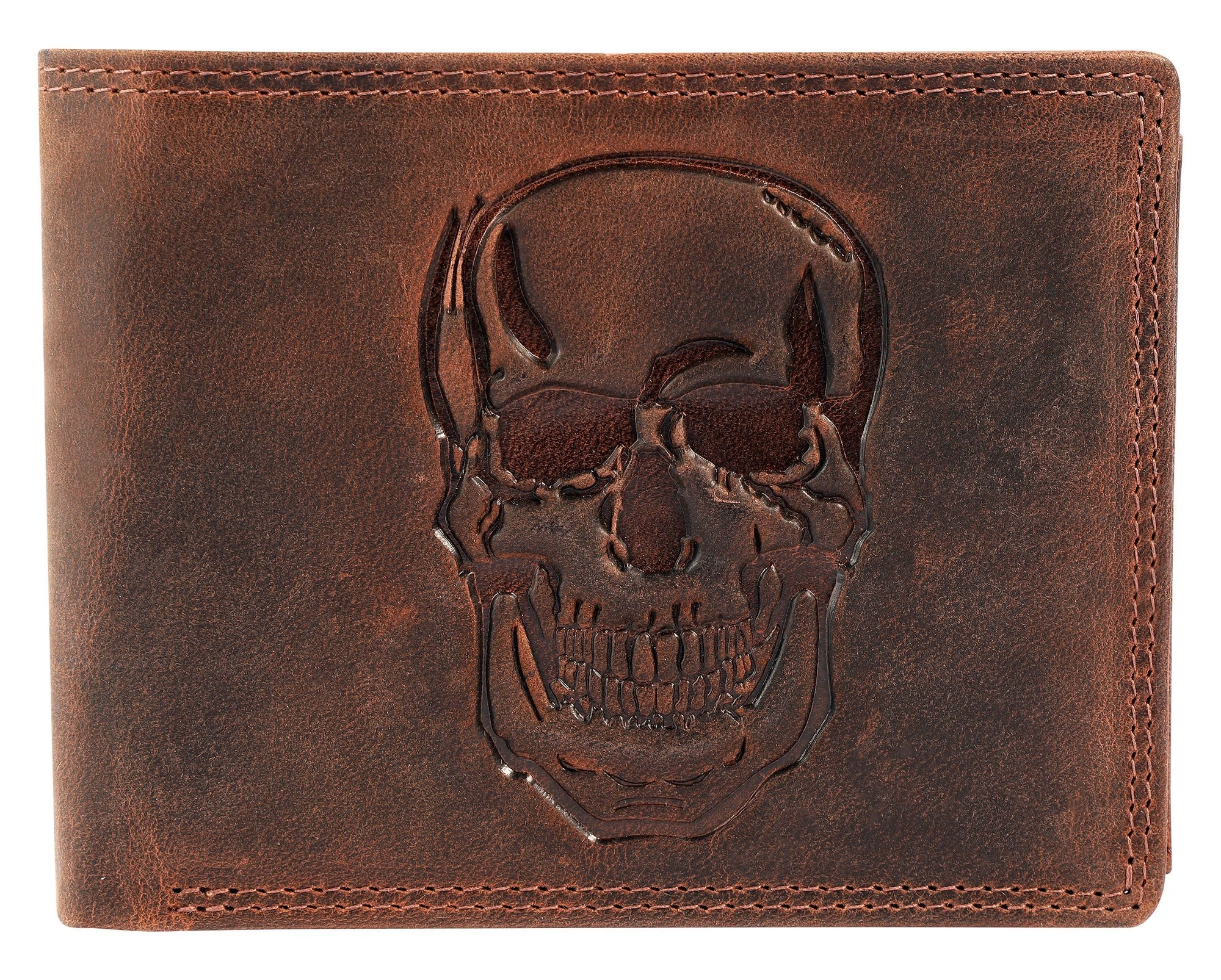 Die Geldbörse der Marke Akzent wurde im Querformat aus Echtleder hergestellt und zeigt sich durch die Prägung in Form eines Totenkopfes im unverkennbarem Design. Die Geldbörse ist ein wahres Platzwunder und bietet viel Stauraum für alle wichtigen Dokumente. Die Doppelnaht im Außen- und Innenbereich sorgt für eine gute Haltbarkeit und Stabilität. Durch die komfortable Einteilung verfügt sie über 6 Kreditkartenfächer, 2 Geldscheinfächer, 1 Münzfach mit Druckknopfverschluss, 1 Reißverschlussfach im inneren Bereich, 2 Einsteckfächer und 3 transparente Ausweisfächer und mittels eines extra Druckknopfverschluss im Innern werden die Karten sicher verwahrt. Die Размер ergibt sich ungefüllt aus einer Длина von 9 cm, einer Breite von 12 cm und einer Stärke von 2 cm. Ein tolles Accessoire mit optimaler Размер für den täglichen Gebrauch.