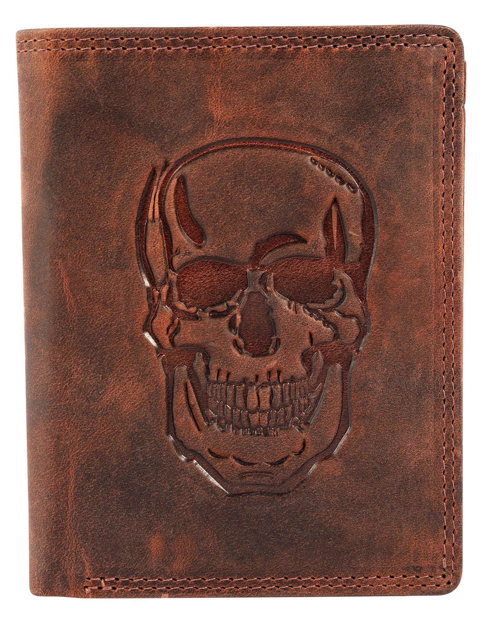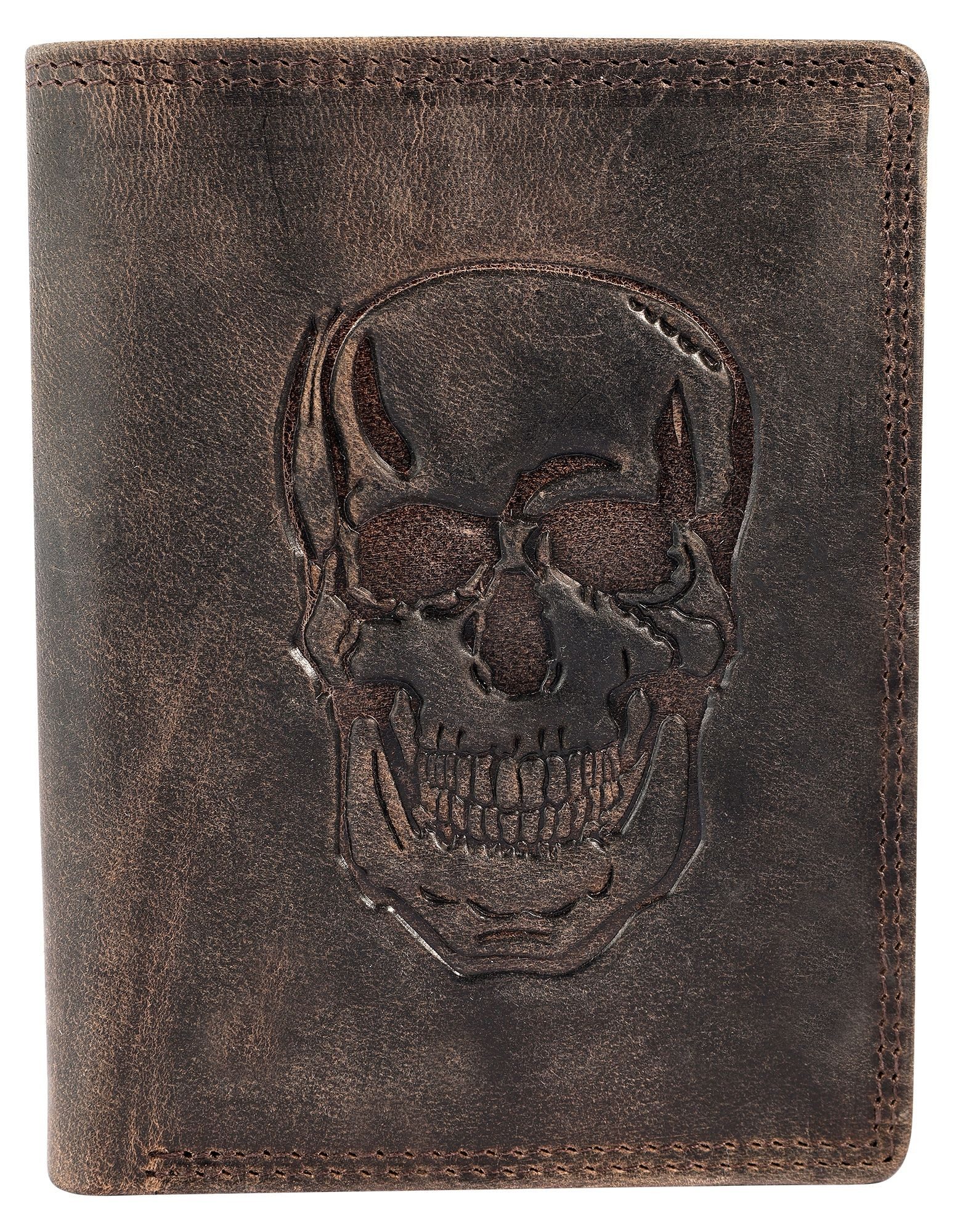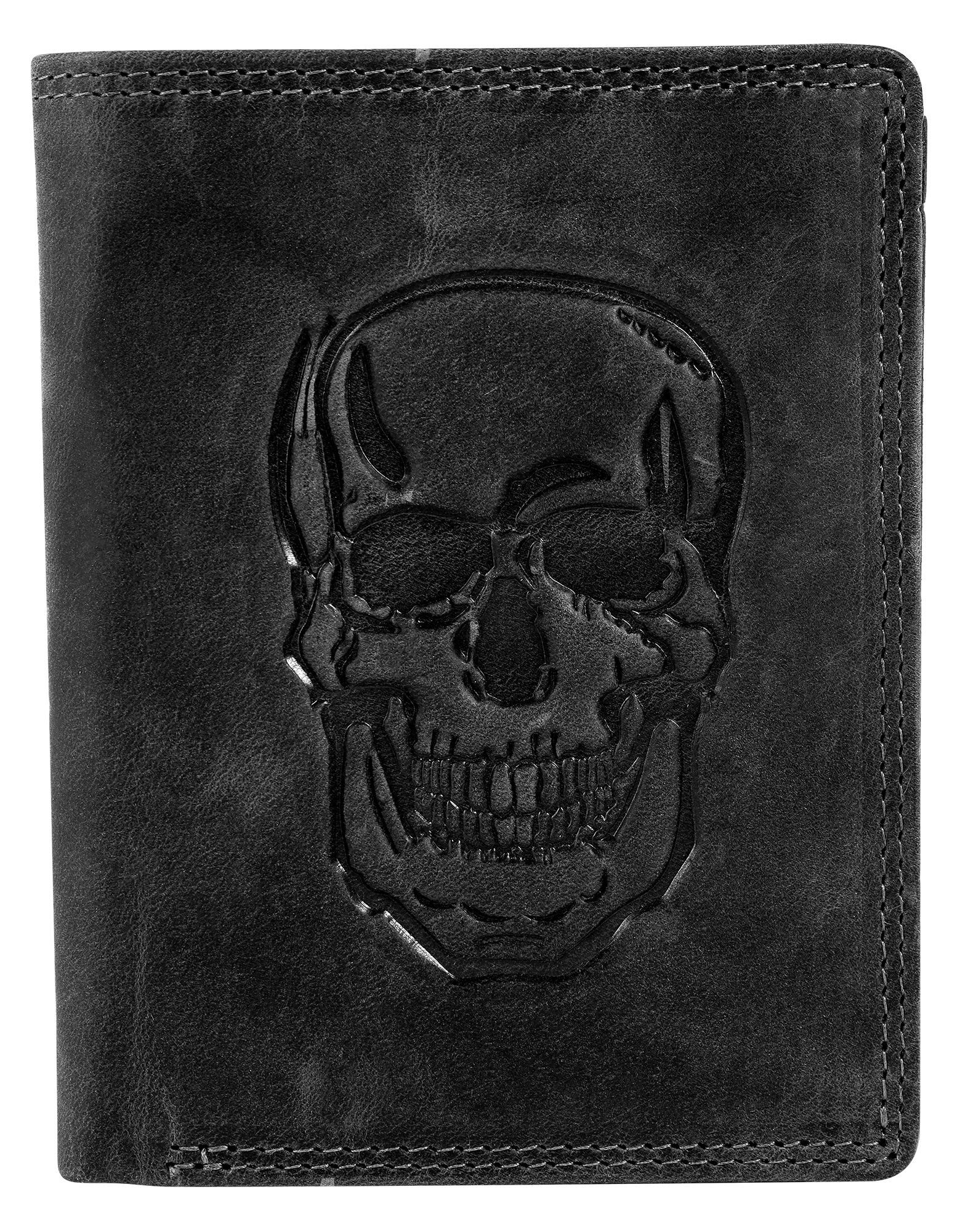 Die Geldbörse der Marke Akzent wurde im Hochformat aus Echtleder hergestellt und zeigt sich durch die Prägung in Form eines Totenkopfes im unverkennbarem Design. Die Geldbörse ist ein wahres Platzwunder und bietet viel Stauraum für alle wichtigen Dokumente. Die Doppelnaht im Außen- und Innenbereich sorgt für eine gute Haltbarkeit und Stabilität. Durch die komfortable Einteilung verfügt sie über 9 Kreditkartenfächer, 2 Geldscheinfächer, 1 Münzfach mit Druckknopfverschluss, 1 Reißverschlussfach im inneren Bereich, 2 Einsteckfächer und 3 transparente Ausweisfächer und mittels eines extra Druckknopfverschluss im Innern werden die Karten sicher verwahrt. Die Размер ergibt sich ungefüllt aus einer Длина von 9 cm, einer Breite von 12 cm und einer Stärke von 2 cm. Ein tolles Accessoire mit optimaler Размер für den täglichen Gebrauch.