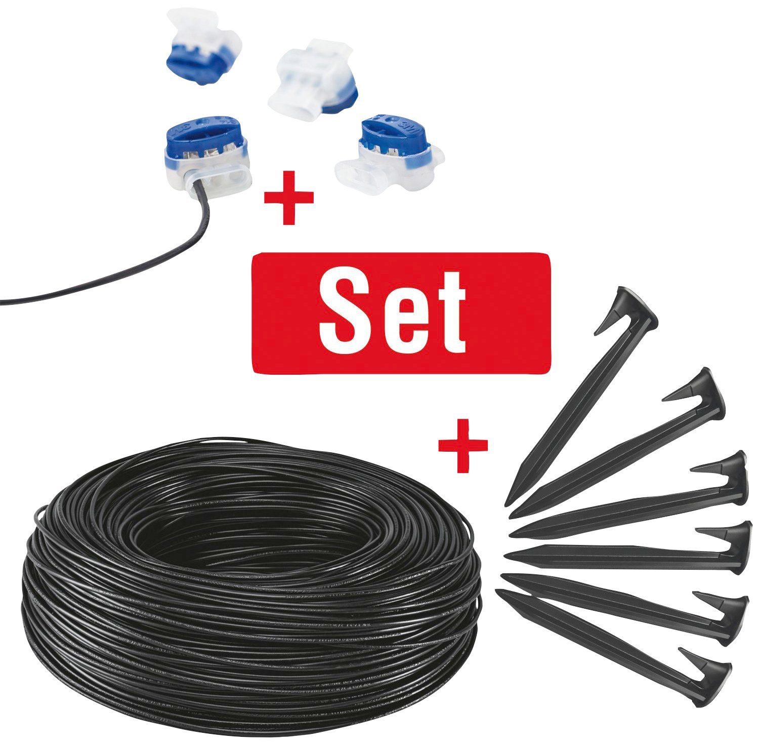 Lieferumfang | 1 x 150 m Schleifenkabel, 1 x 90 Stück Bodennägel, 5 Stück Kabelverbinder |