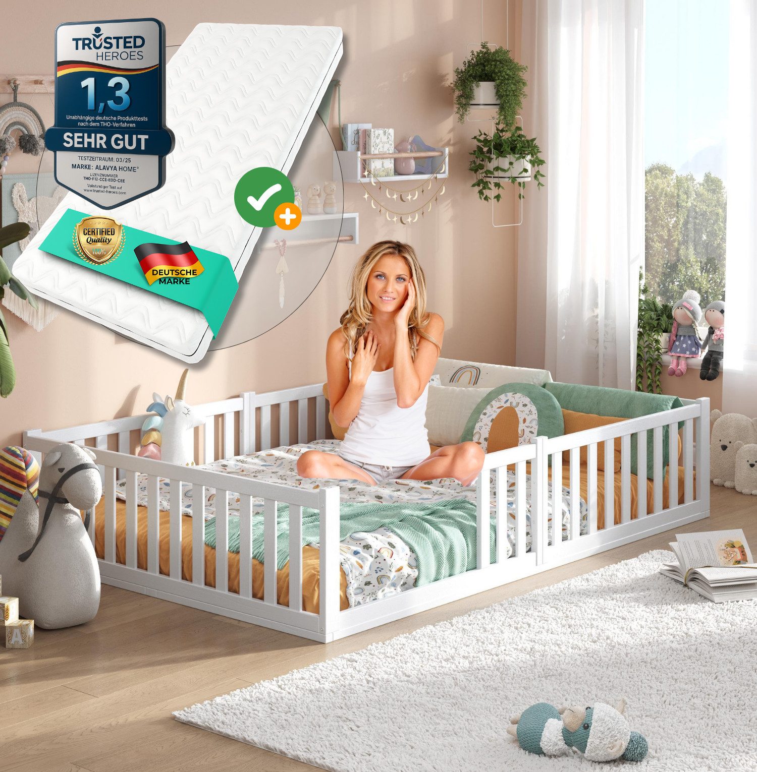 Das Bodenbett von Alavya Home bietet eine gemütliche und praktische Schlafmöglichkeit, die Kinder zum Schlafen und Träumen einlädt. Die niedrige Höhe des Bettes ermöglicht es Ihrem Kind, eigenständig ein- und auszusteigen, ohne Hilfe von Erwachsenen. Das Bett hat eine großzügige Liegefläche und ist bereits mit einem passenden Lattenrost ausgestattet. Der Rausfallschutz sorgt für Sicherheit während des Schlafens und erleichtert den Zugang zur Liegefläche. Es ist robust genug, um auch den lebhaftesten Abenteuern Ihres Kindes standzuhalten.
