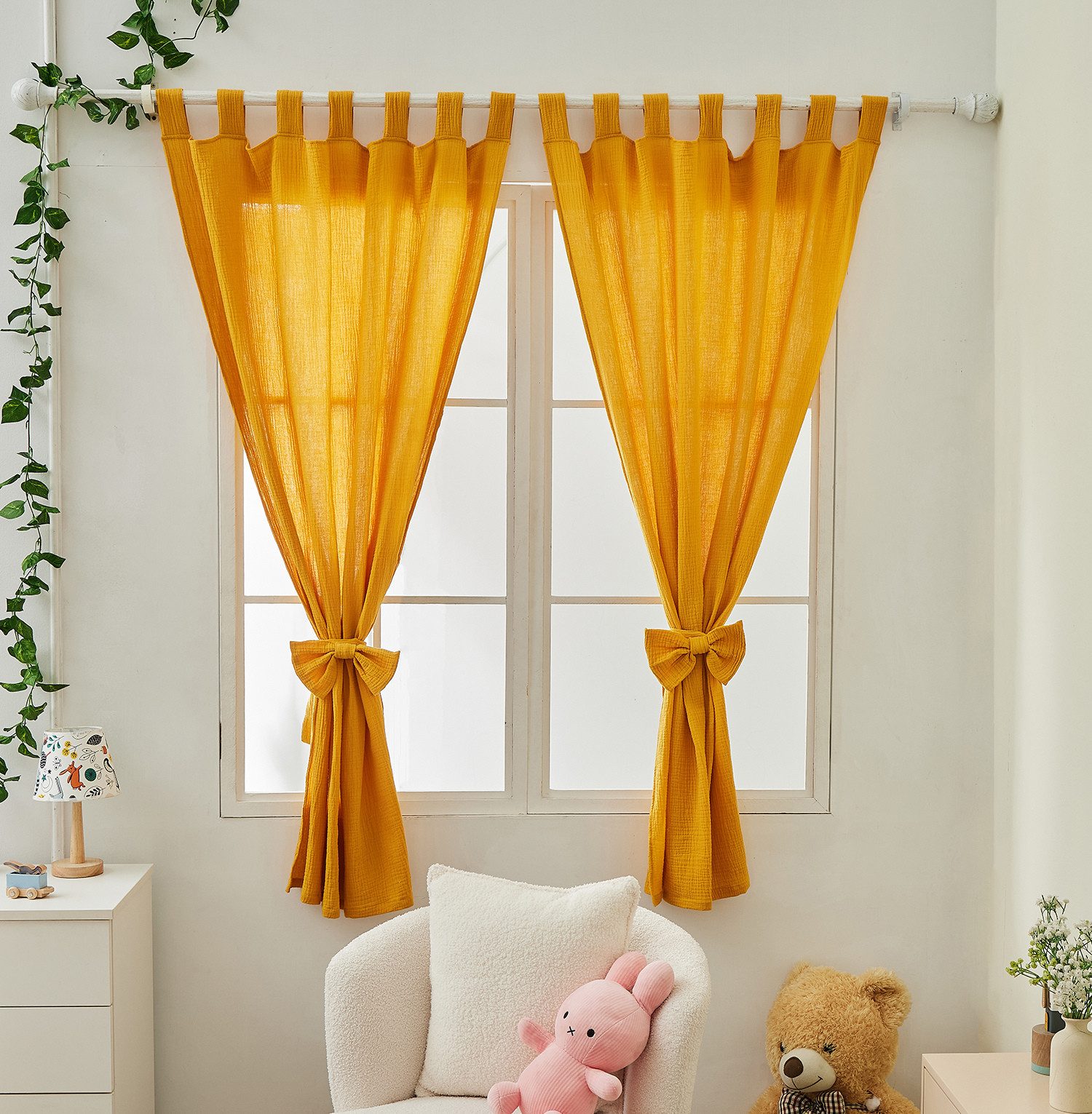 Mit einer Размер von 100 x 150 cm passen unsere Vorhänge perfekt in jedes Kinderzimmer. Wählen Sie aus vier wunderschönen Farben - Weiß, Khaki, Rosa und Senfgelb - und gestalten Sie den Raum nach Ihrem persönlichen Geschmack.
